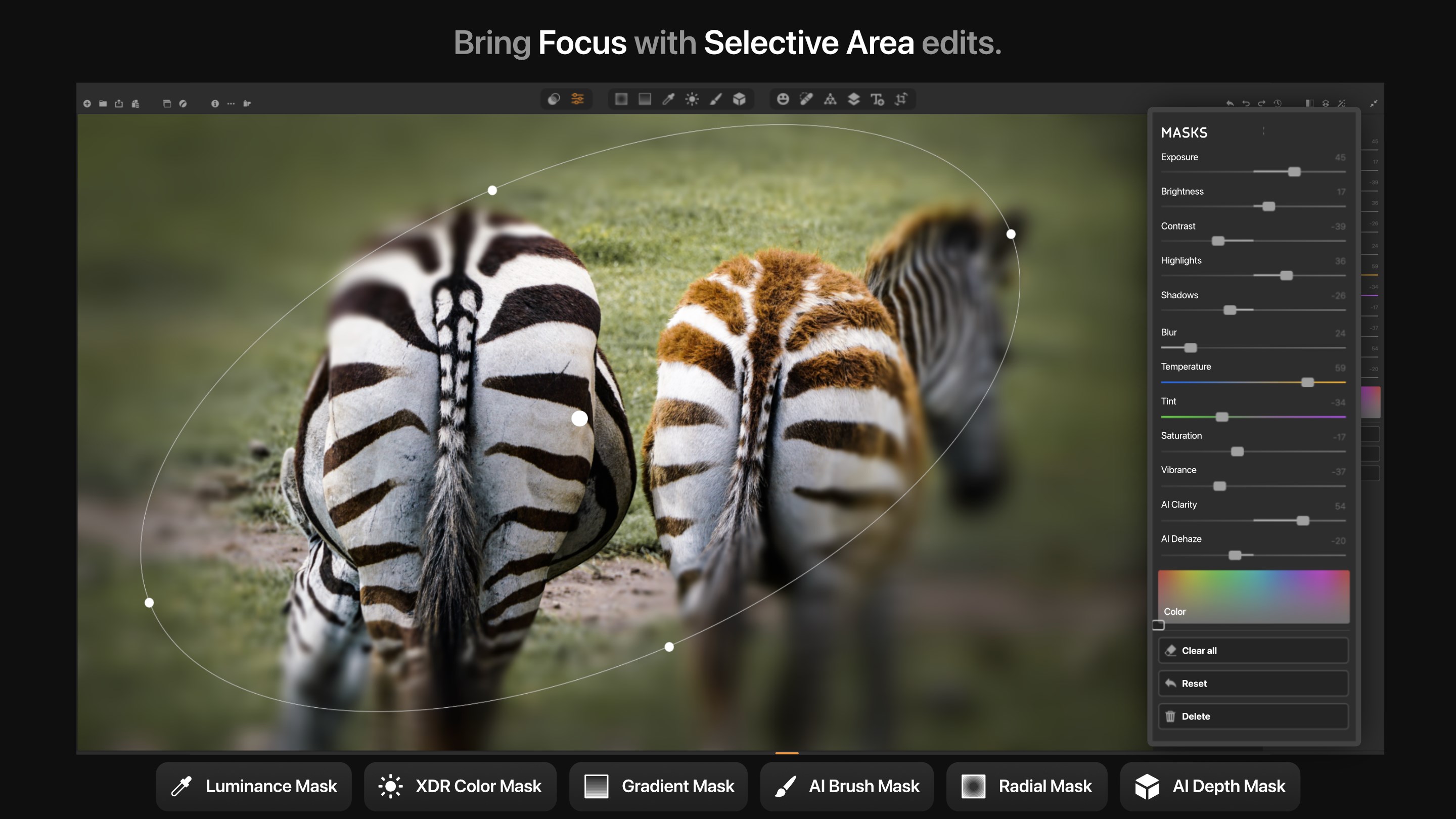 β’ Local adjustments. Make local changes with masks and brushes. Apply Radial, Gradient, Brush, Luminance, Depth masks. Insert custom overlays in the selected area.