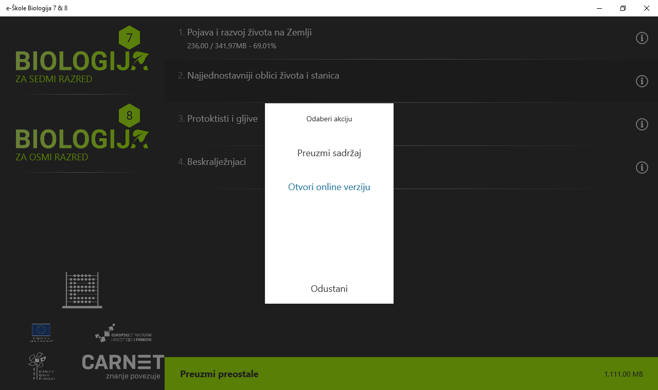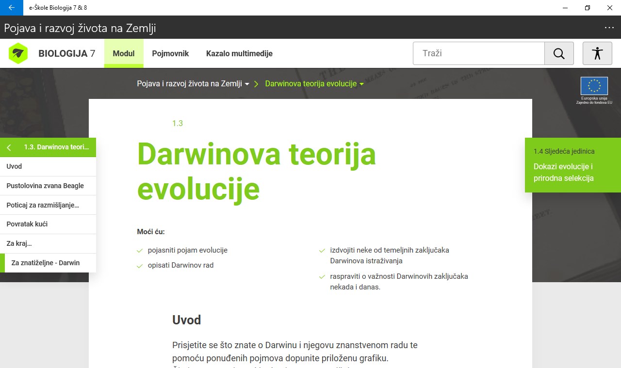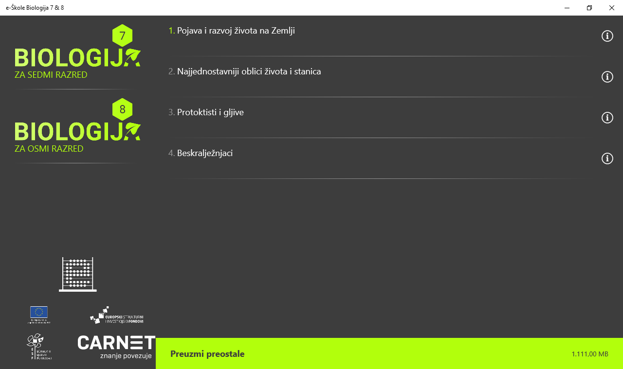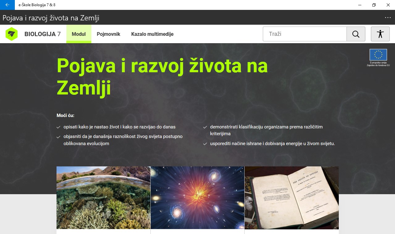 Kroz aplikaciju su dostupni digitalni obrazovni sadržaji za 7. i 8. razred predmeta Biologija. Izrađeni su u obliku manjih cjelina (modula) koje se može zasebno koristiti, ali pokrivaju gradivo cijelog razreda. Sadrže tekstualne, audio, video, multimedijalne i interaktivne elemente, kvizove, pitalice, vježbe, simulacije i animacije, kao i eksperimente i problemske zadatke. Aplikacija omogućava korištenje sadržaja online, a za korištenje offline potrebno je u aplikaciji preuzeti pojedine module. Pri korištenju sadržaja moguće je podesiti postavke koje reguliraju kontrast, povećanje i prilagodbu vrste slova i elemenata. Ovi sadržaji i aplikacija izrađeni su u sklopu projekta "e-Škole: Uspostava sustava razvoja digitalno zrelih škola”.