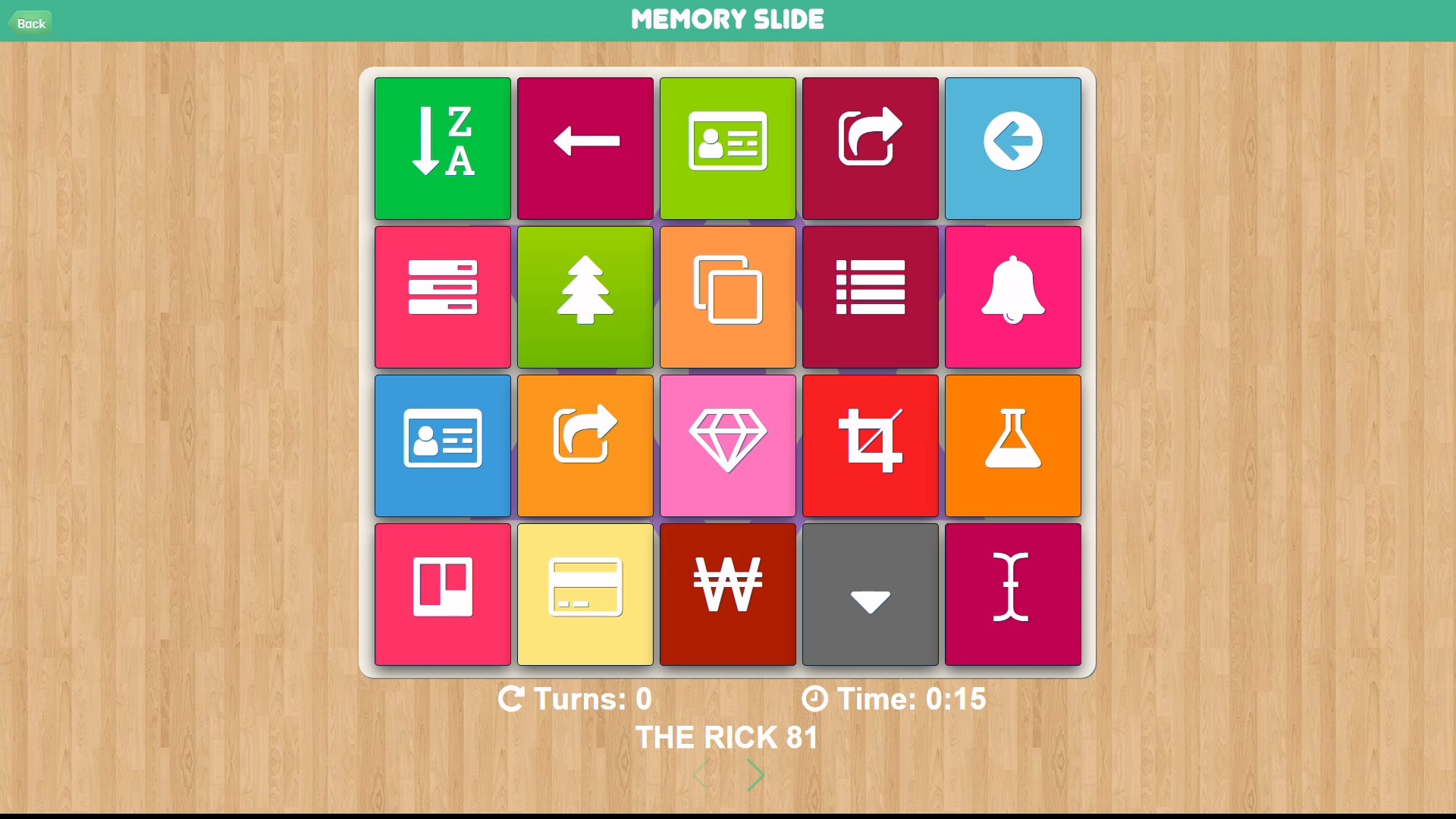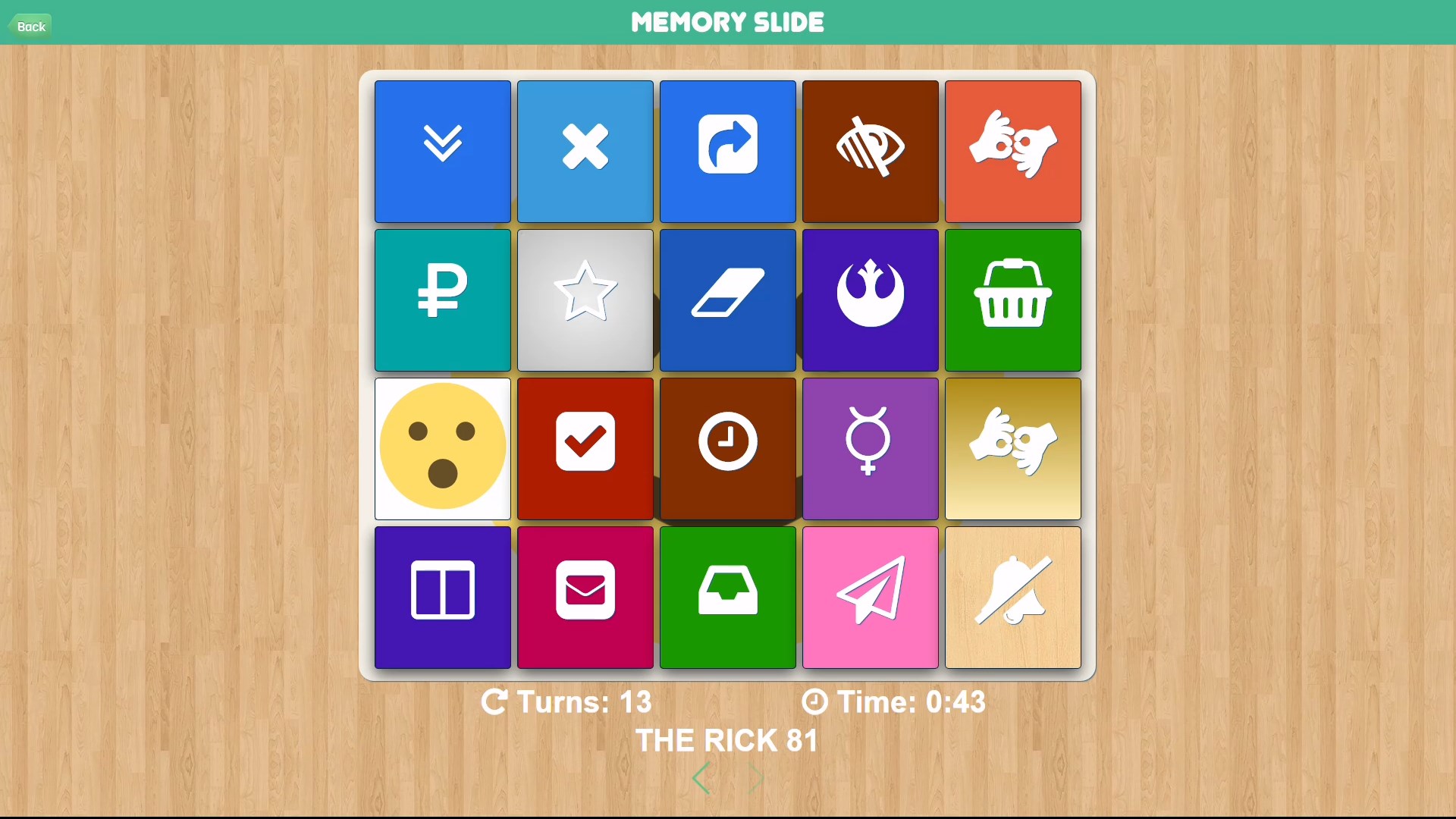 Memory Slide is the classic memory game with a twist. You may have to slide to the left or right in order to find your match. Every game of Memory slide is different. There are millions of different combinations that are chosen at random, so you are not likely to play the same game twice. This game will help any person young or old to train their memory and concentration skills. Choose from 3 levels of difficulty. Also Features an online Leaderboard
