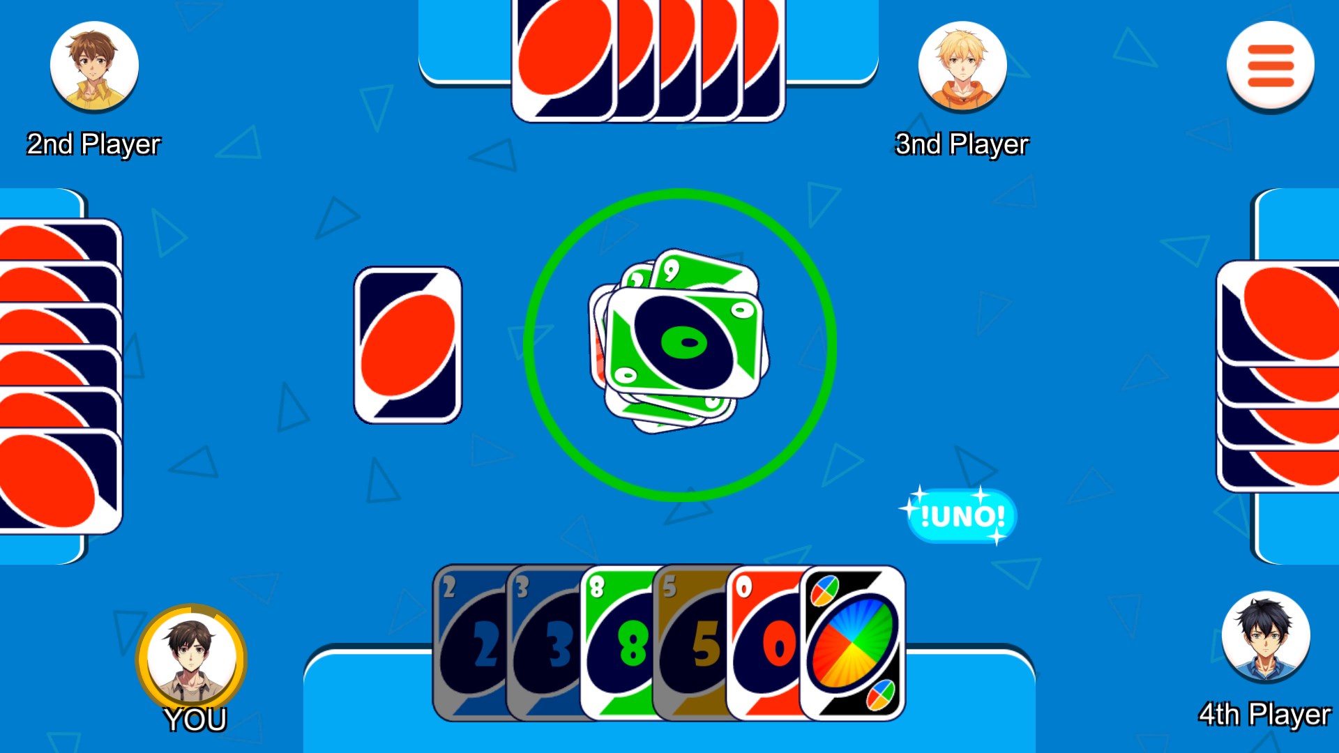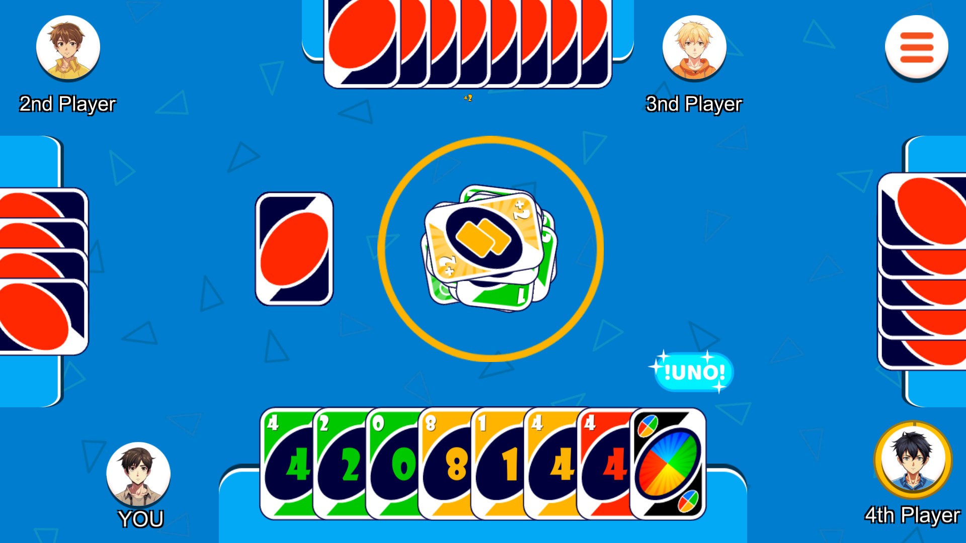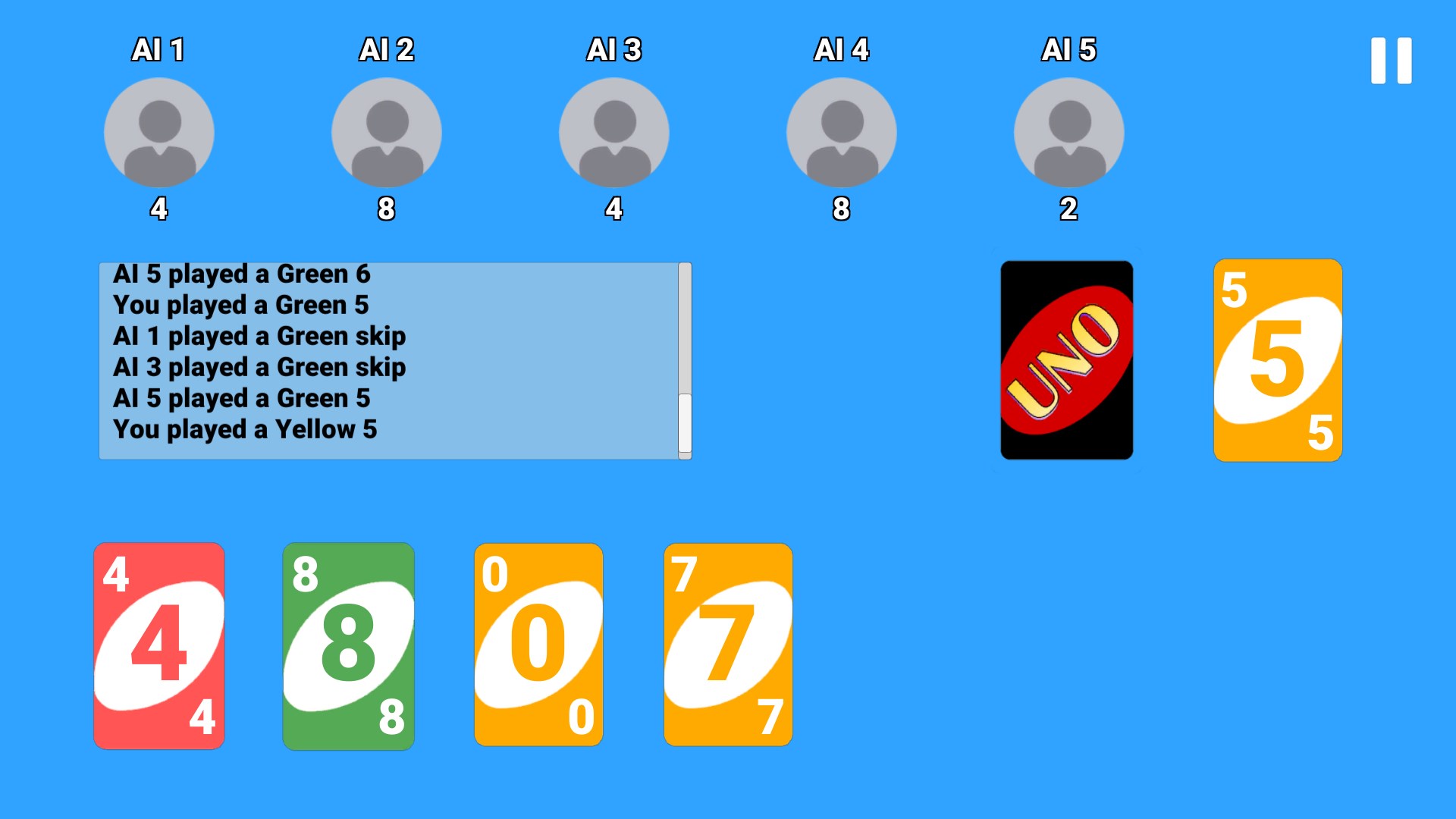 Single Player Mode: Challenge yourself against 1 to 5 AI opponents U+1F916Six-Player Mode U+1F0CF: Play with up to 6 players, including AI opponentsEveryone: Suitable for kids U+1F476, families U+1F468βU+1F469βU+1F467βU+1F466, and card game enthusiasts U+1F9D1βU+1F91DβU+1F9D1 of all ages.AI Opponents U+1F916Challenge up to 5 AI opponents with unique strategiesClassic Game with Modern Twist β¨Smooth graphics for a visually pleasing experienceA game loved by generationsIdeal for family game nightsEasy-to-learn rulesGreat for parties and casual playClassic Card Action U+1F3A8U+1F522Special Action Cards U+1F504βοΈU+1F0CFUNO Call U+1F4E2Solo Play with AI U+1F916Stunning Visuals U+1F308U+1F3ACSimple Yet Strategic Gameplay U+1F9E9U+1F9E0Family-Friendly Fun U+1F468βU+1F469βU+1F467βU+1F466Fun for All Ages U+1F468βU+1F469βU+1F467