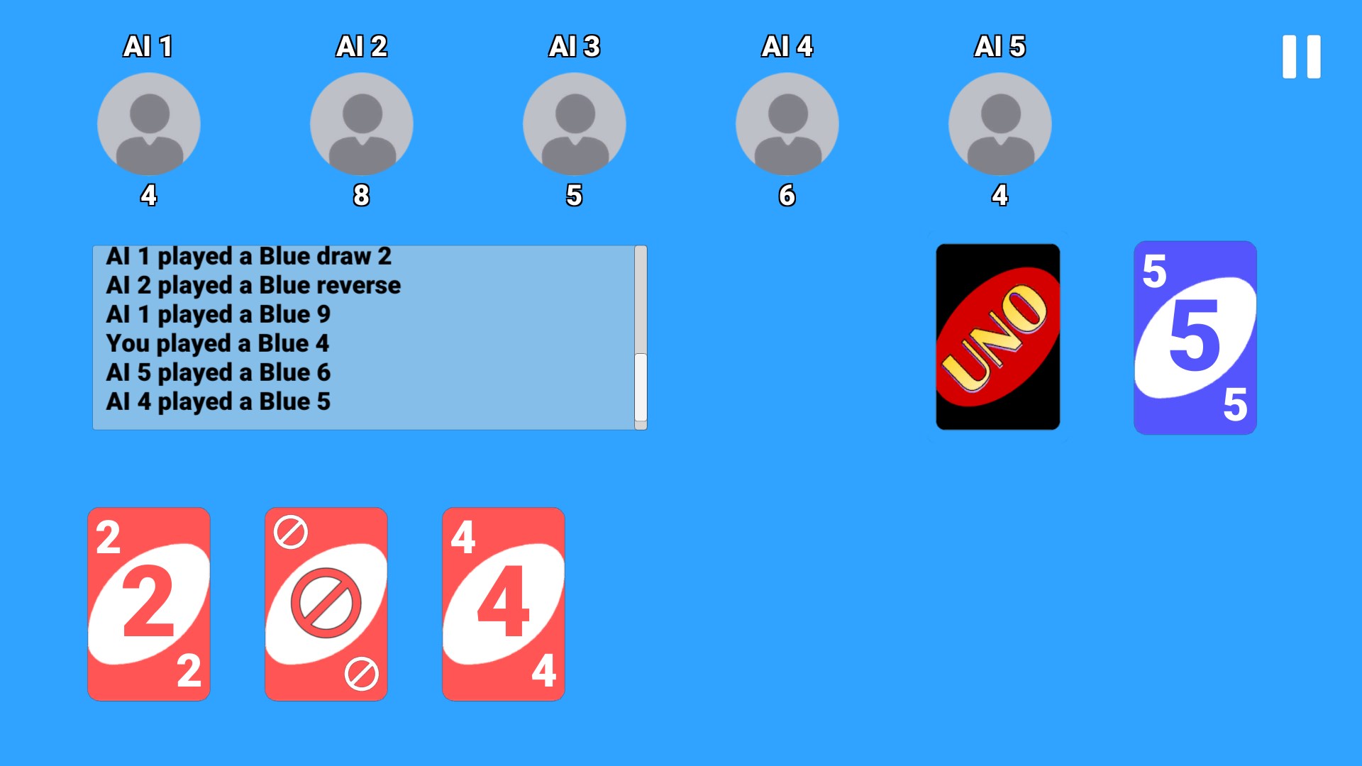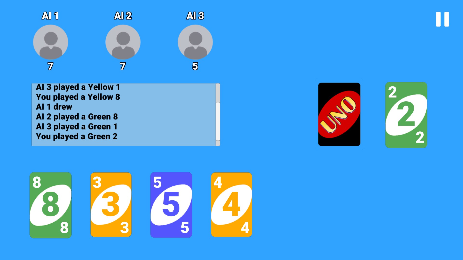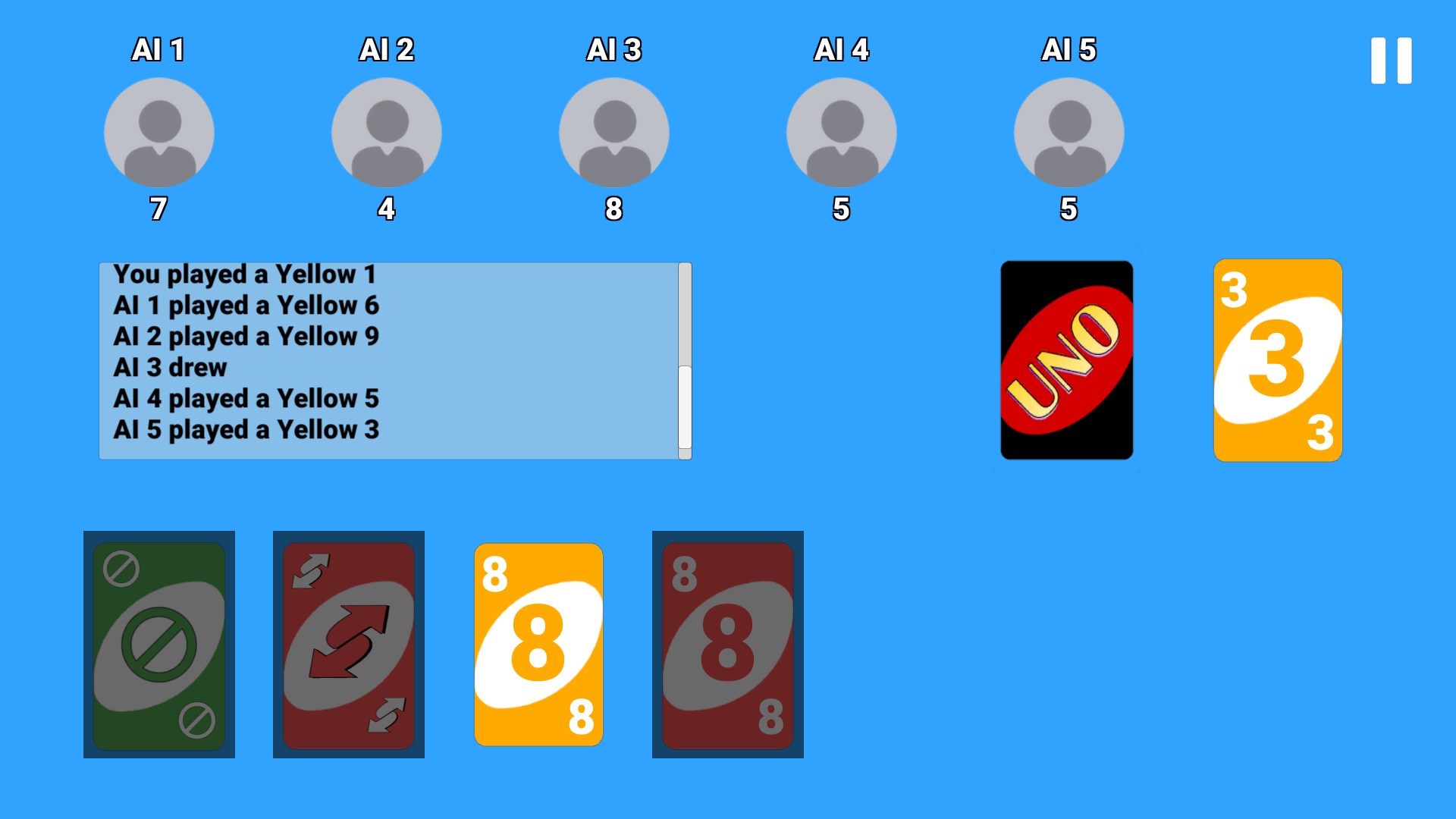 Single Player Mode: Challenge yourself against 1 to 5 AI opponents U+1F916Six-Player Mode U+1F0CF: Play with up to 6 players, including AI opponentsEveryone: Suitable for kids U+1F476, families U+1F468βU+1F469βU+1F467βU+1F466, and card game enthusiasts U+1F9D1βU+1F91DβU+1F9D1 of all ages.AI Opponents U+1F916Challenge up to 5 AI opponents with unique strategiesClassic Game with Modern Twist β¨Smooth graphics for a visually pleasing experienceA game loved by generationsIdeal for family game nightsEasy-to-learn rulesGreat for parties and casual playClassic Card Action U+1F3A8U+1F522Special Action Cards U+1F504βοΈU+1F0CFUNO Call U+1F4E2Solo Play with AI U+1F916Stunning Visuals U+1F308U+1F3ACSimple Yet Strategic Gameplay U+1F9E9U+1F9E0Family-Friendly Fun U+1F468βU+1F469βU+1F467βU+1F466Fun for All Ages U+1F468βU+1F469βU+1F467