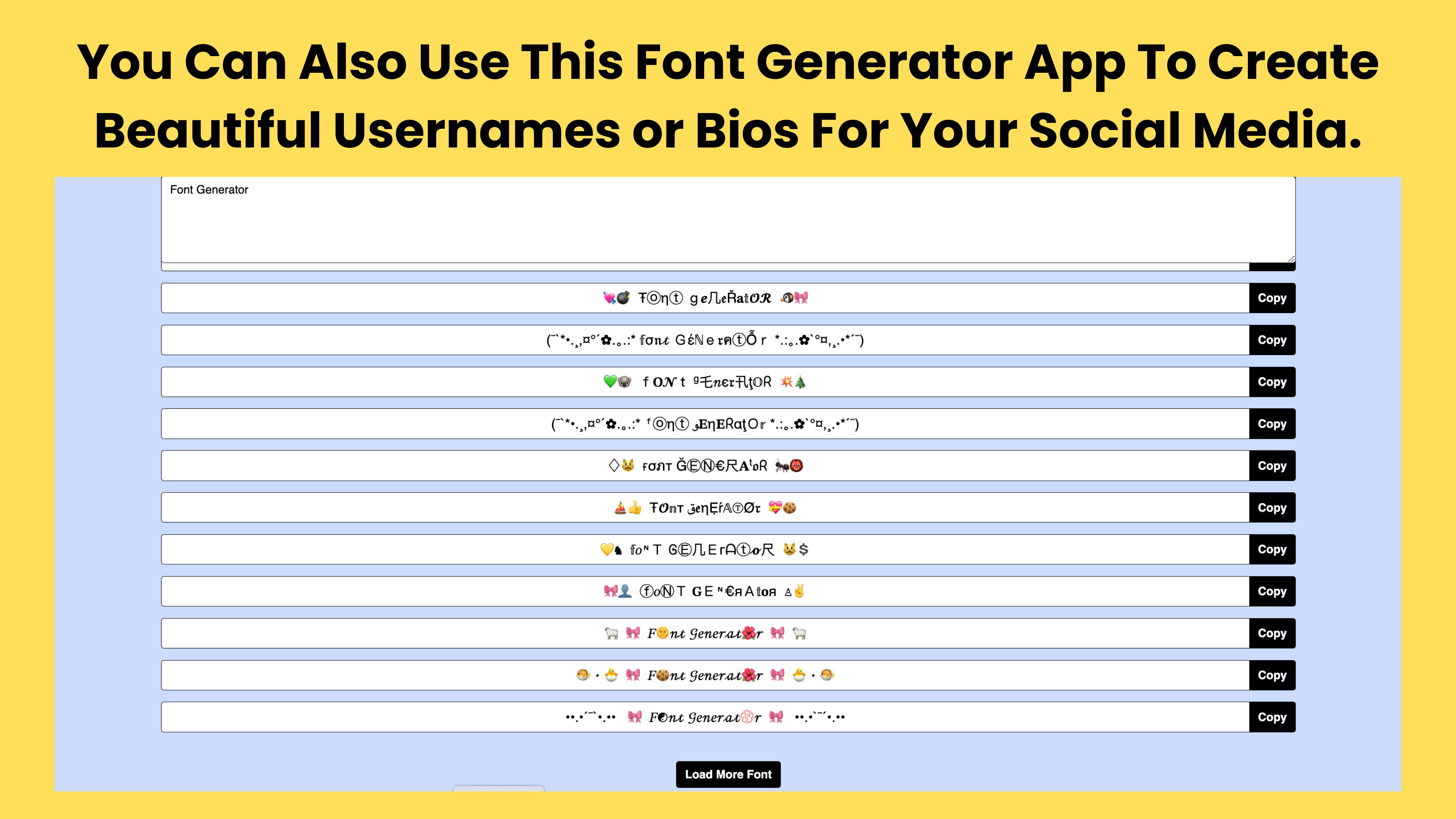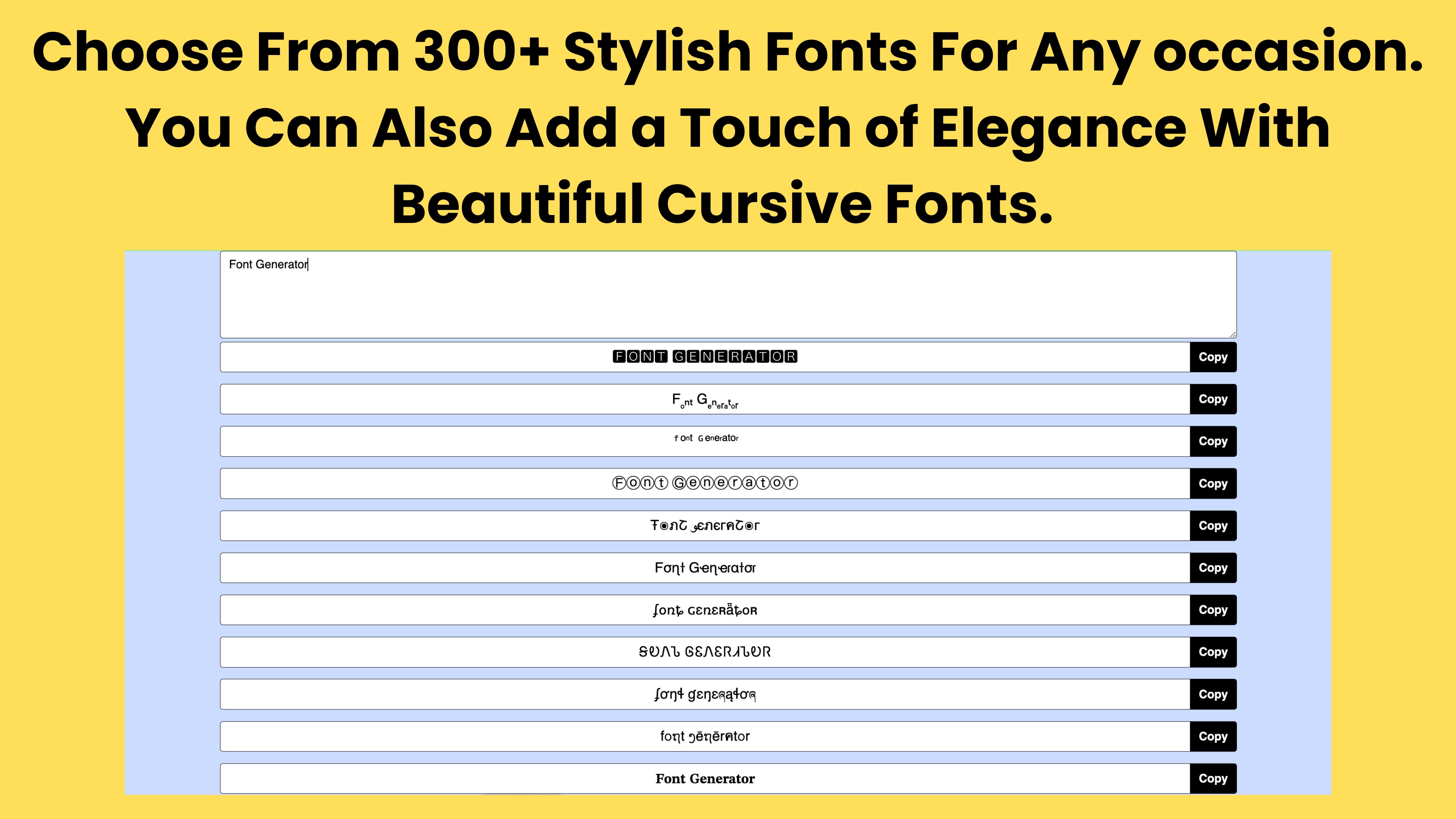 Fonts Generator: Choose from 300+ stylish fonts for any occasion.Font Text Generator: Transform ordinary text into fancy, eye-catching designs.Cursive Font Generator: Add a touch of elegance with beautiful cursive fonts.Copy Paste Font Generator: Effortlessly copy and paste your favorite styles.Font Generator Free: Enjoy all features without any hidden charges.Style Font Generator: Explore creative and unique font styles to stand out.Font Generator Copy and Paste: Perfect for social media, gaming nicknames, or bio updates.Fancy Font Generator: Make your text look cool and impressive!