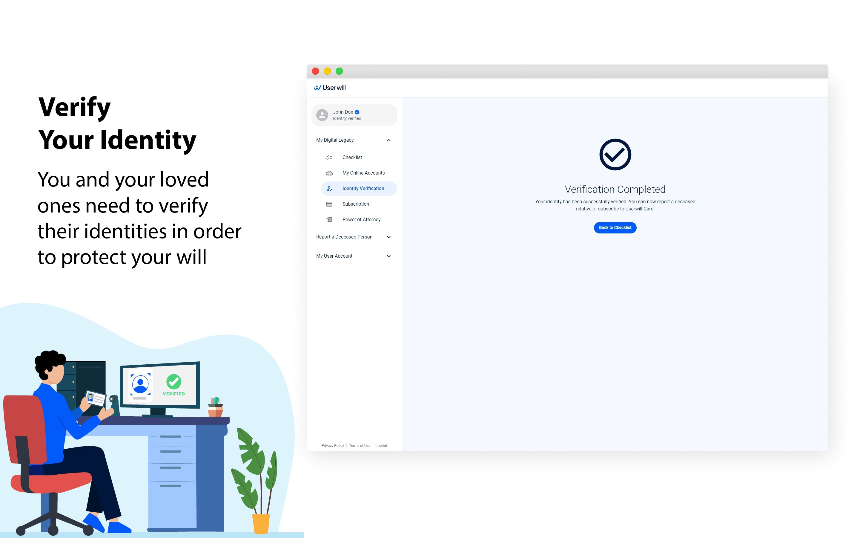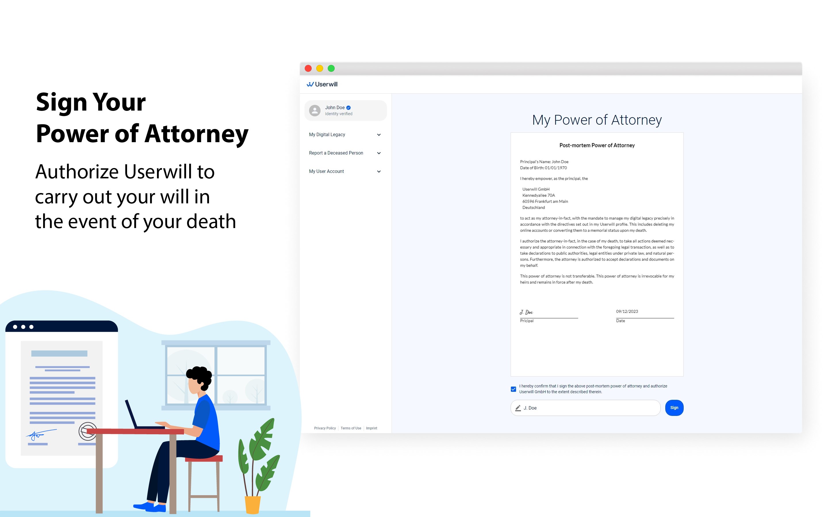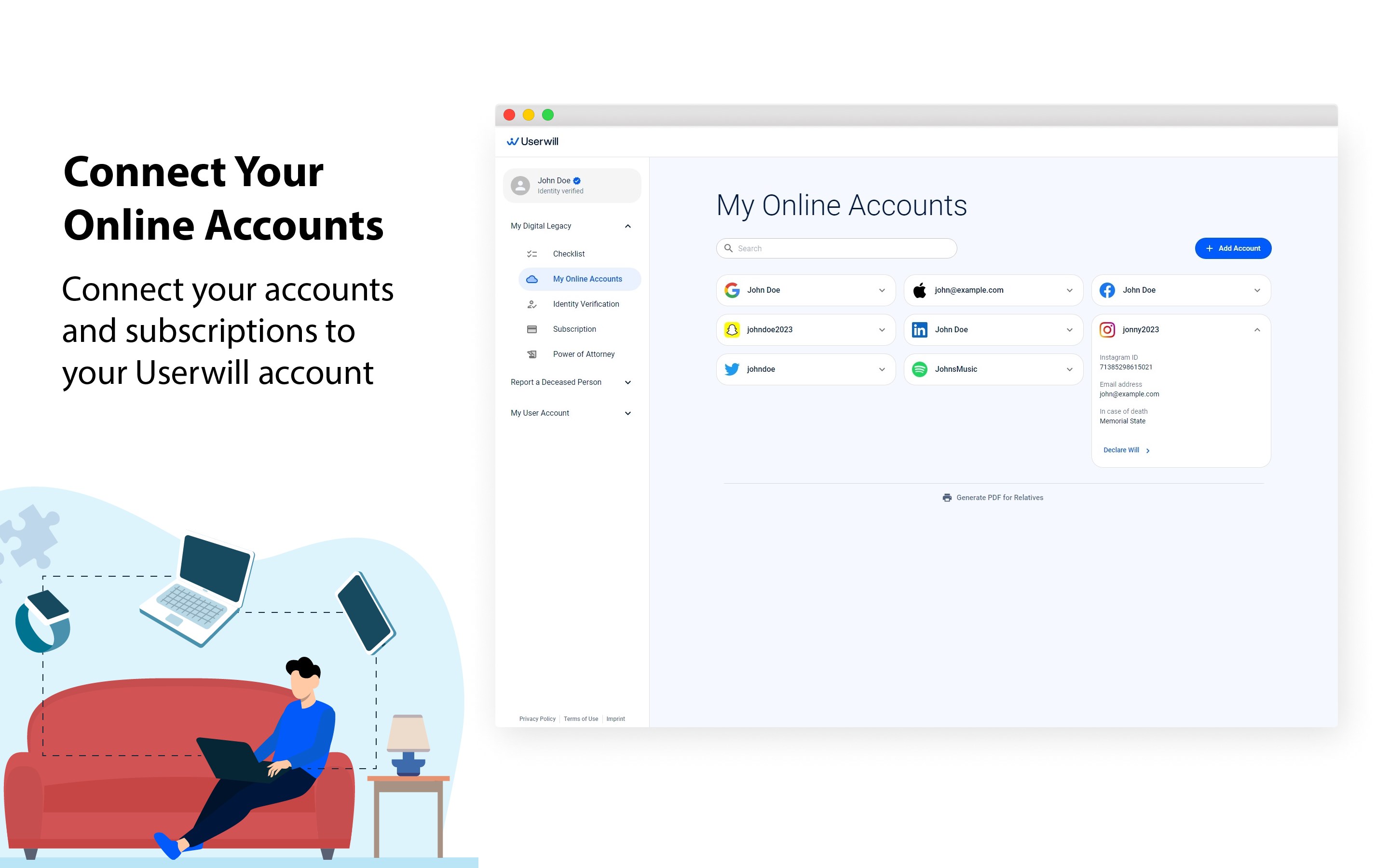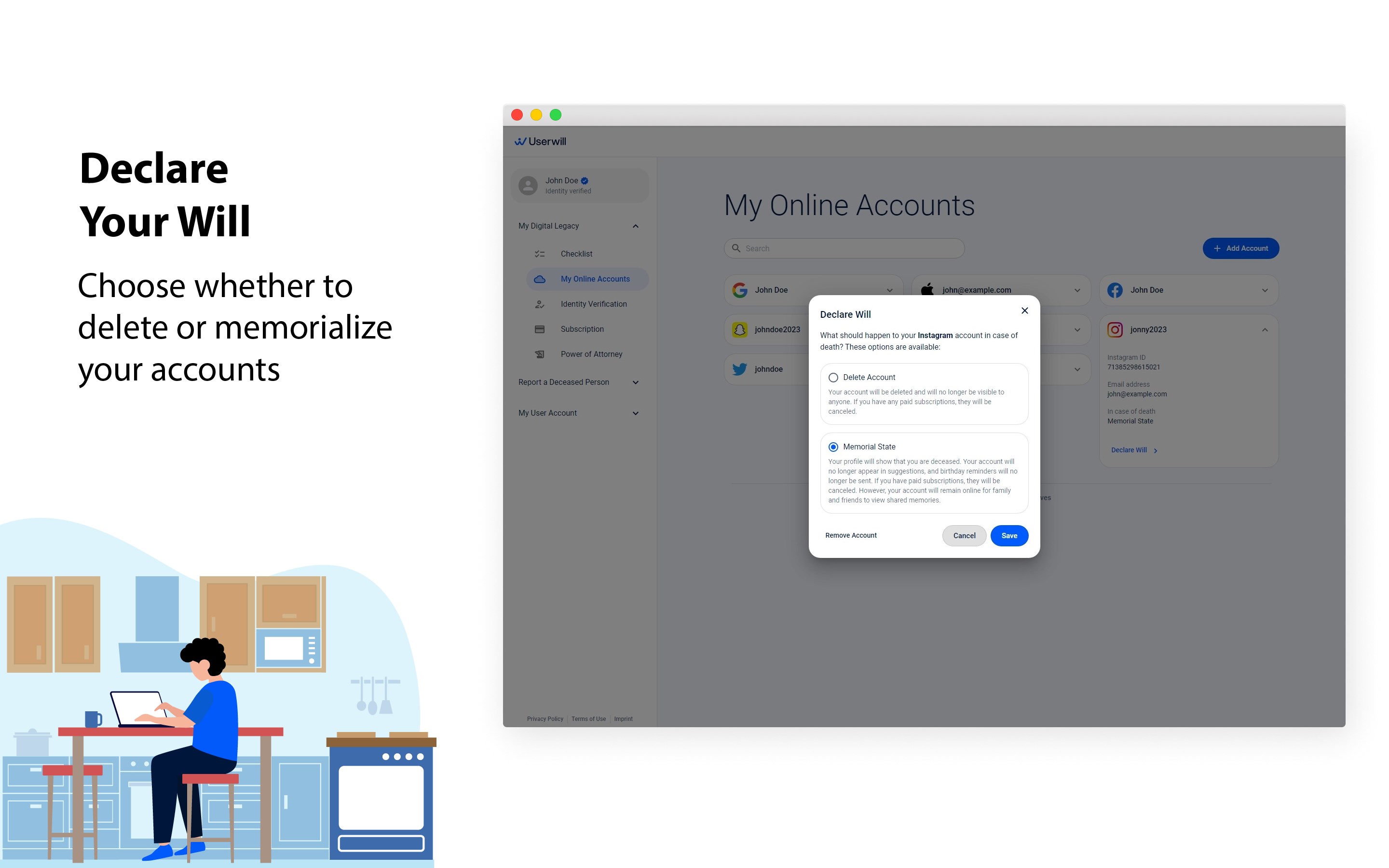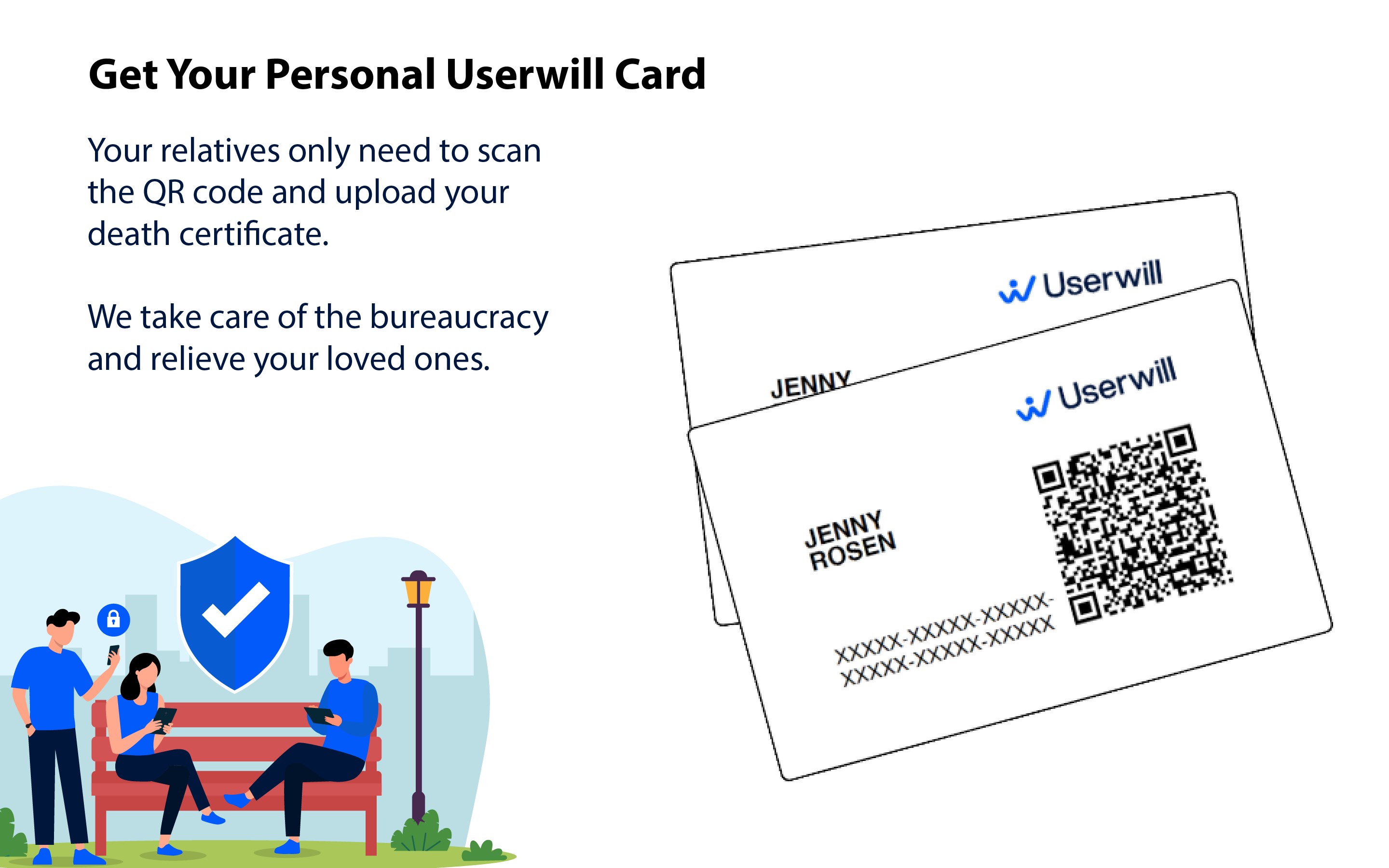 Link your online accounts from Facebook, Instagram, Snapchat, Twitter, Spotify & Co.Declare your wishes as to what should happen to your online accounts in the event of your deathSign your post-mortem power of attorney onlineReceive your Userwill cards with your personal Userwill ID, which you can pass on to relativesYour relatives can inform us about your death using your Userwill IDWe carry out your declared will and thus relieve your relatives