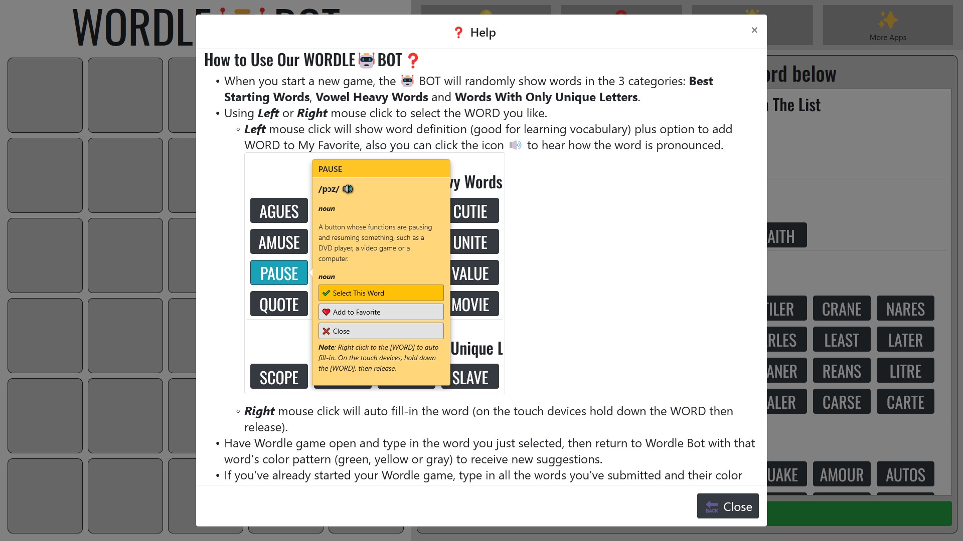 - Includes word definition (good for learning vocabulary), and BING translate- Click the icon U+1F50A to hear how the word is pronounced- Add Words to My Favorite for easy re-use them as starting word in the next game.- Our U+1F916 BOT will provide the most accurate, relevant suggestions.