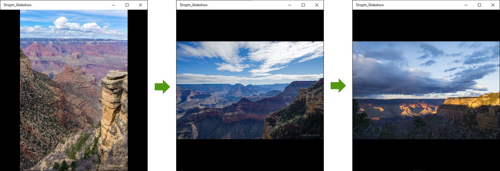 With DropIn Slideshow, you can quickly create a slideshow – just add images using drag and drop. Once you have added two or more images, the show begins! You can view the slideshow in its own window while you run other apps, or see the show in full screen mode.