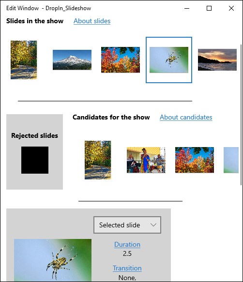 In the DropIn Slideshow edit window, you add slides, remove slides, and rearrange slides. You can also add transition effects or sound effects to the slides. When you're happy with your slideshow, save your show script to a "script" file. The next time you want to see the show, double click the script file. You can also record your slideshow to a video file in .mp4 format so you can easily share it with friends.