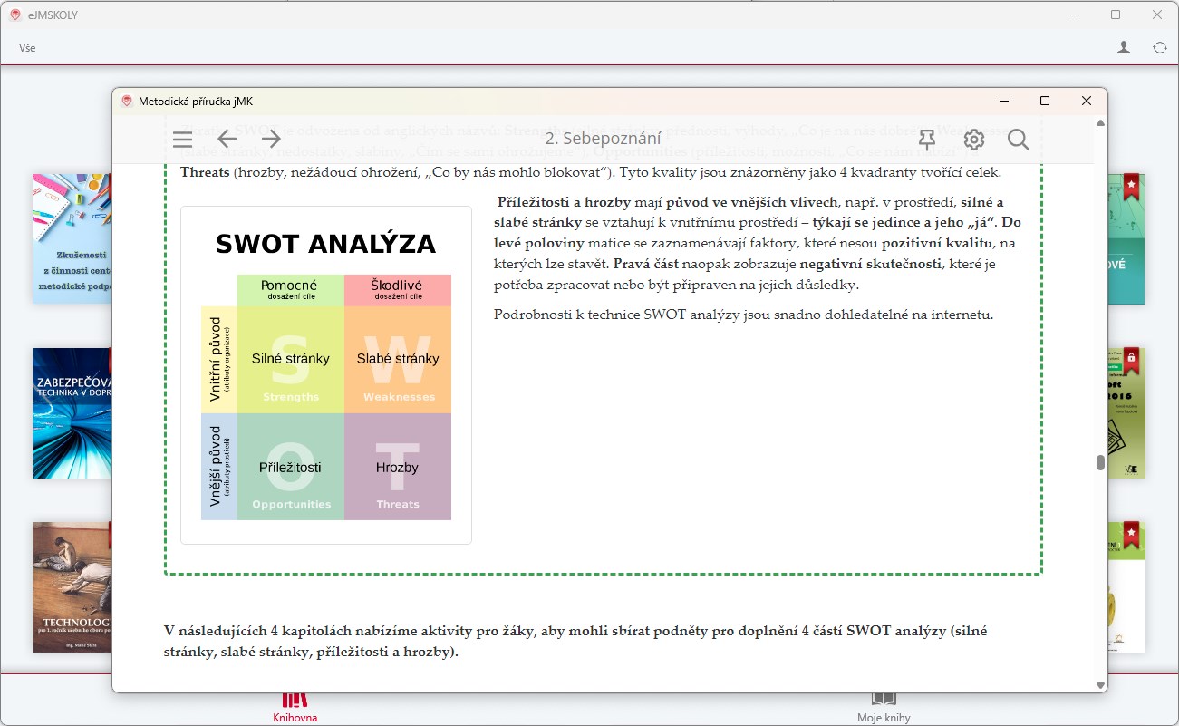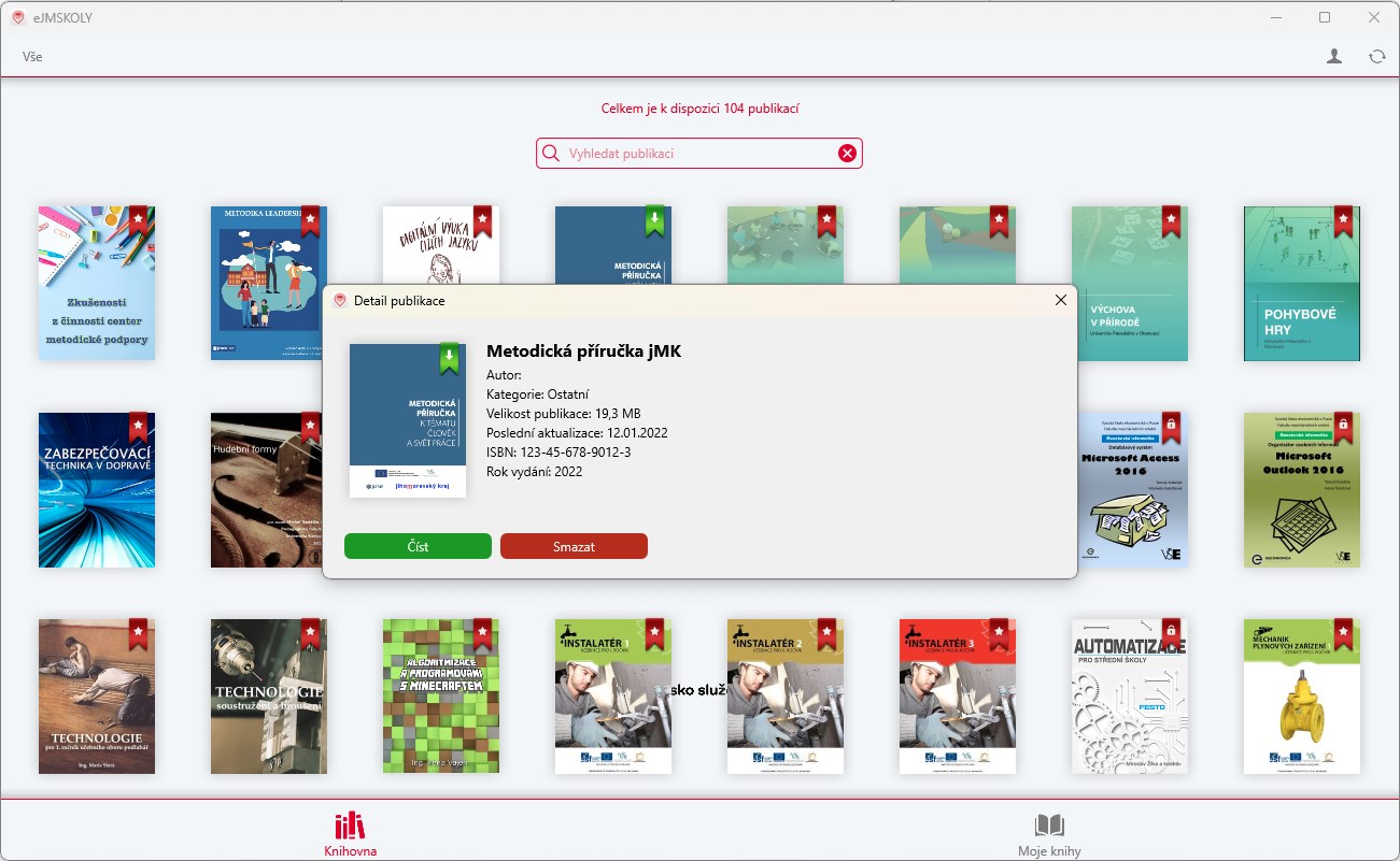 stahování dostupných publikací ze serverutřídení a mazání stažených publikací v Knihovněvyhledávání v seznamu publikacíkategorie publikacípamatování rozečtené kapitoly a jeho místaoznačování textuobarvování textutvorba poznámek do textu a jejich barevného rozlišenítvorba výtahu textu z publikacesdílení označeného textusdílení zabarveného textusdílení poznámeksdílení výtahuvyhledávání v publikaciseznam poznámek a podtržení v publikacíchseznam obrázků, videí a vzorcůseznamy a jejich položky automaticky odkazují na stranu textukompatibilita s externími soubory přímo v publikacíchlogin, řízení distribuce publikací podle práv uživatelůpodpora více formátů publikací (HTML NEW, PDF)