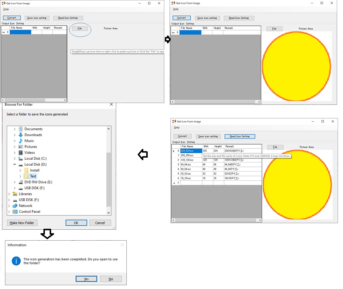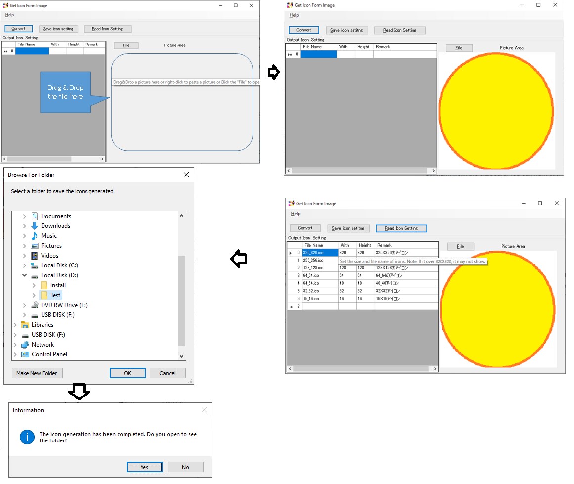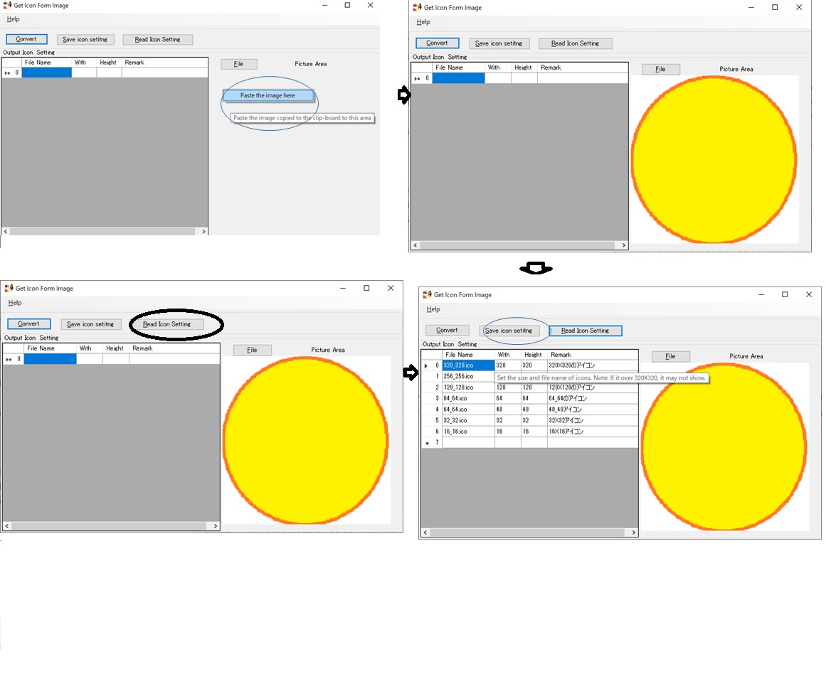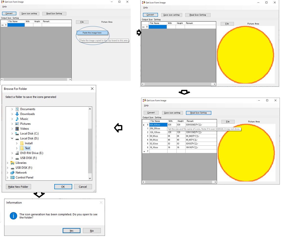When you make a Windows application, you have to create some tool icons. The icon format is ICO, not same as other common image files such as PNG/JPEG. They can’t be converted into icon files. Moreover, many different icon size is required. If you can directly convert files such as PNG/Jpeg into icon files, it will save a lot of power. This tool can generate icons of multiple sizes from one image. There are two types of input for the conversion source image. You can use an image file or the clipboard. The generated icon size and file name can be set arbitrarily. Many different size’s icon files can be generated at one time. The icon generation settings can be saved to a file. When the icon generation is needed again, the tool can be read from the file. So you have not to input the settings each time. This tool is simple and practical, with hints on every button, which is very easy to use. And there are help files available for reference at any time.
