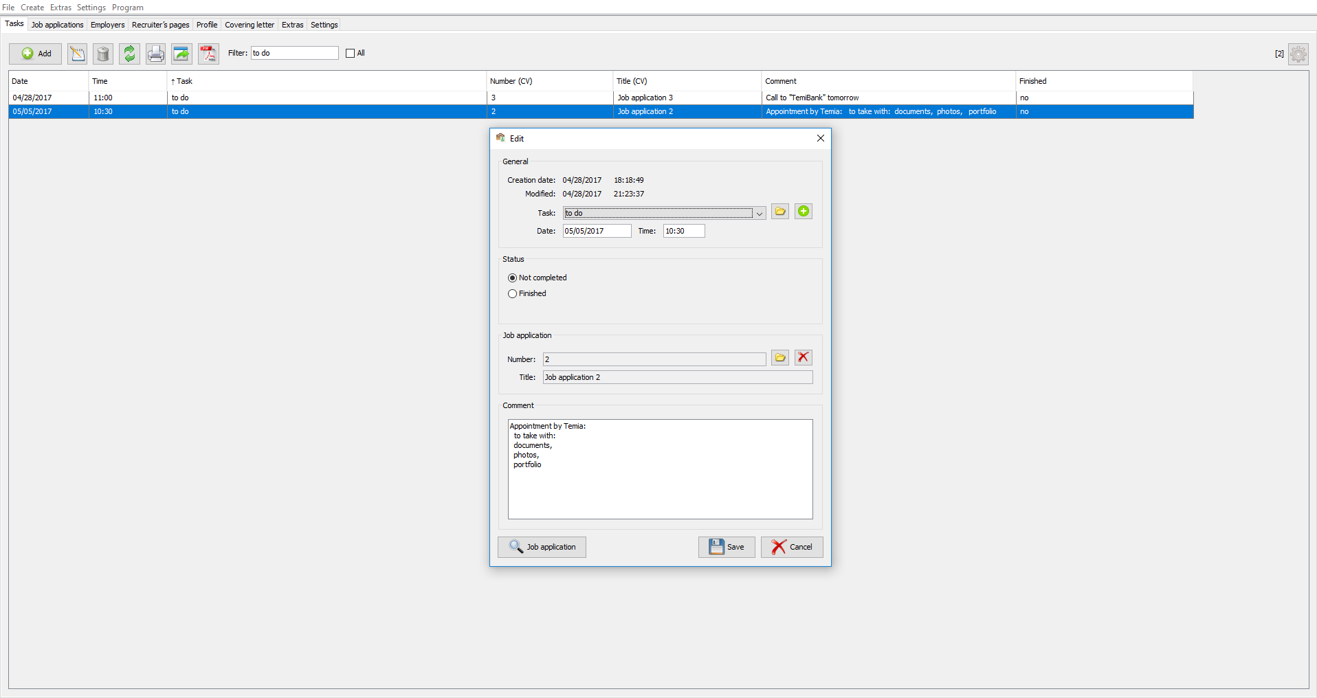 You can add tasks in the program, which are reminders of upcoming affairs. Each task can be linked to a job application. Completed tasks can be labelled as “completed”.