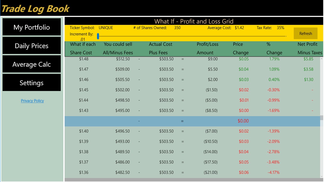 TradeLogBook is an amazing Windows 10 Application that will provide you immediate feedback on the profit/loss positions you hold. This is an advantage to making good trade decisions.