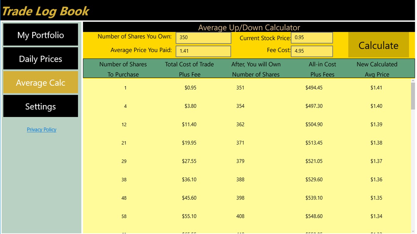 TradeLogBook calculates the Average Cost, and includes the cost of each trade into that calculation. Avoid making a trading error because you haven’t calculated all the fees accumulated.
