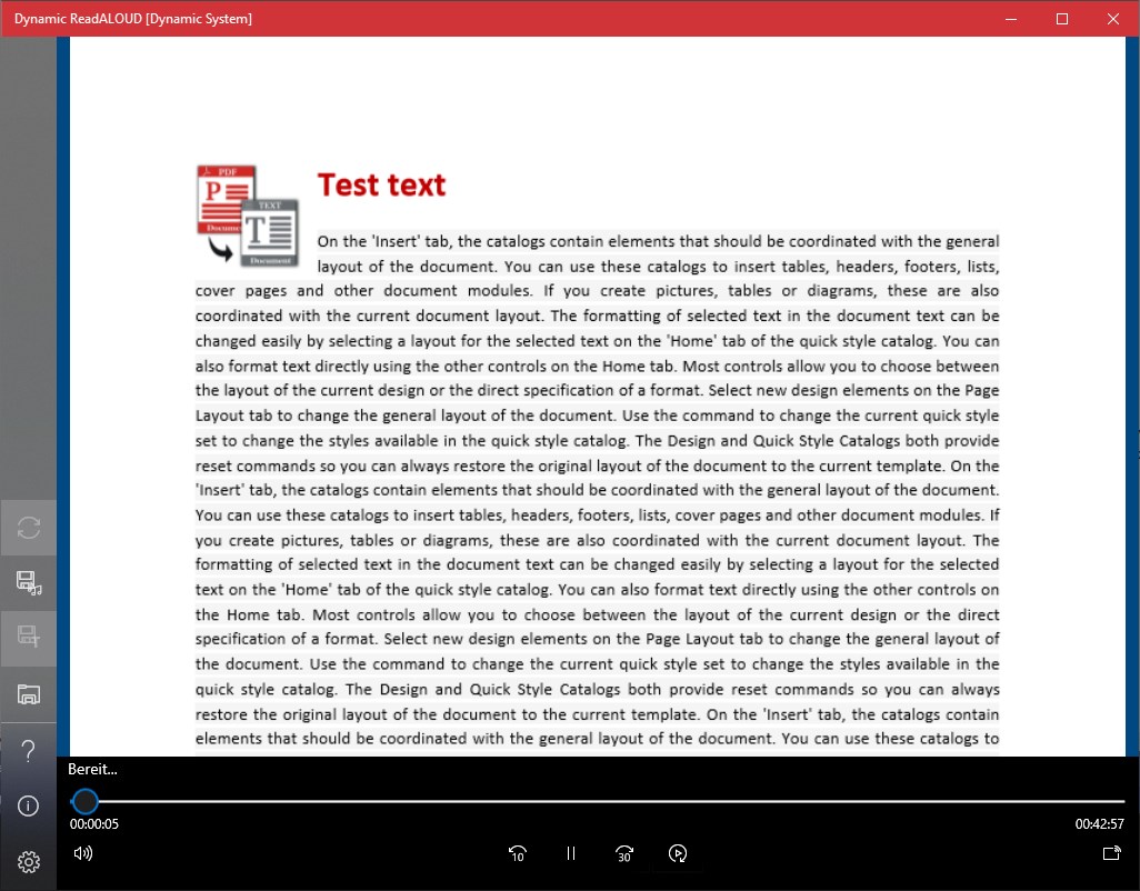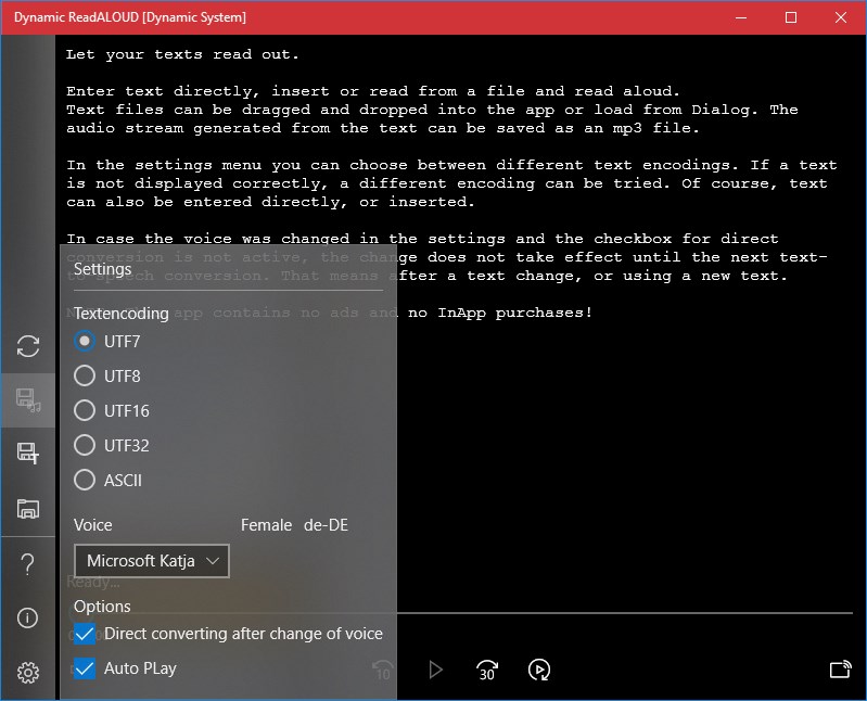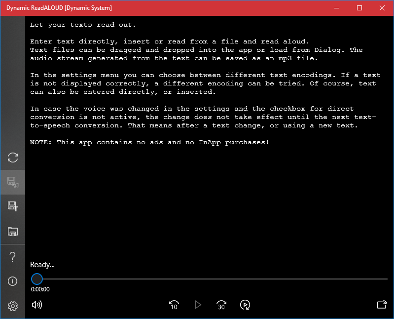 Let your text read aloud. With this ad-free app, you can enter and paste text directly or read them from a file and have them read aloud. Text files can be dragged and dropped into the app, or loaded using a file selection. The audio stream generated from the text can be saved as an mp3 file.