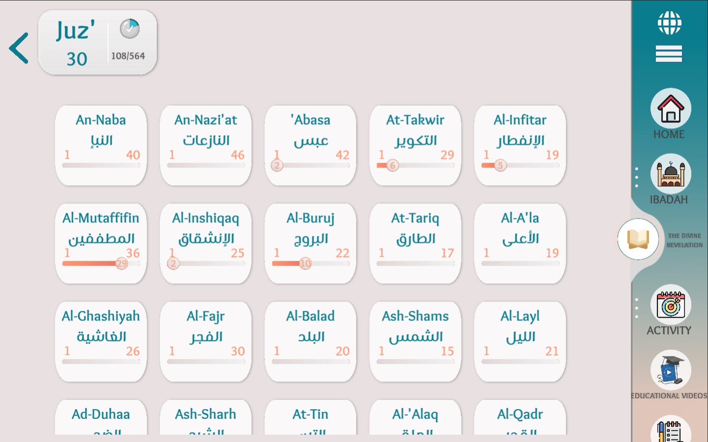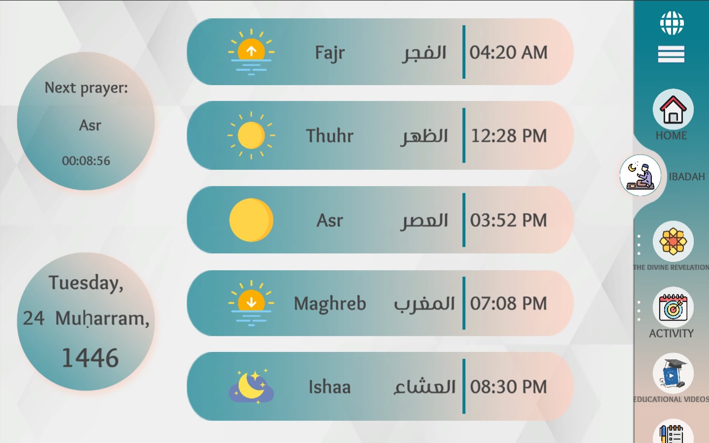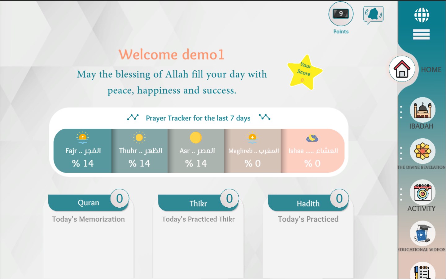 An application for teaching Islamic education to students (Islamic Treasures). The application contains 6 sections (Ibadah, THE DIVINE REVELATION, ACTIVITY, Videos, Assignments and Quizzes) in addition to the main page and displays the student's assessment, each section has its own content. We designed the application to meet the needs of young students to master Islamic education and teach them how to read Arabic fluently in an easy and fun way. We have also associated student performance evaluation with the teacher. This application is intended for school students