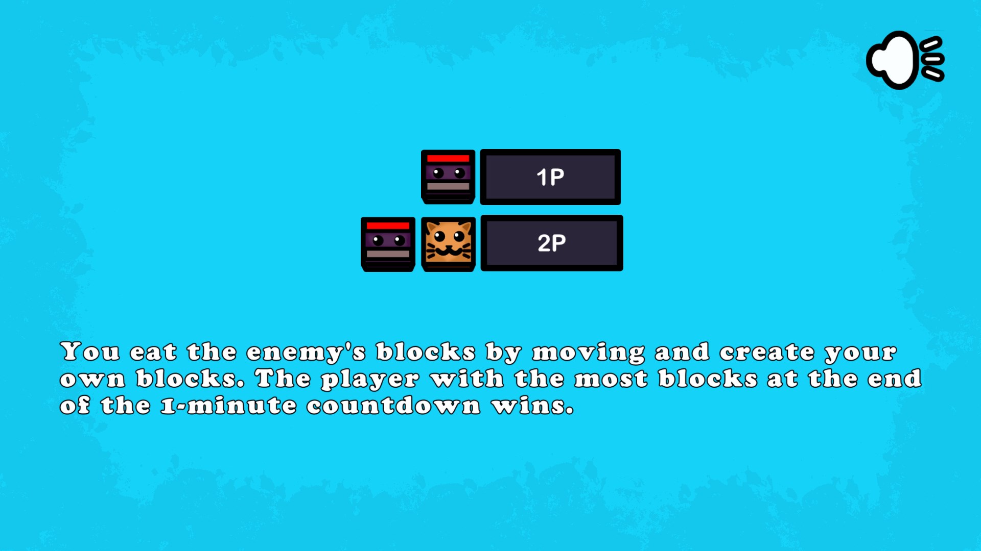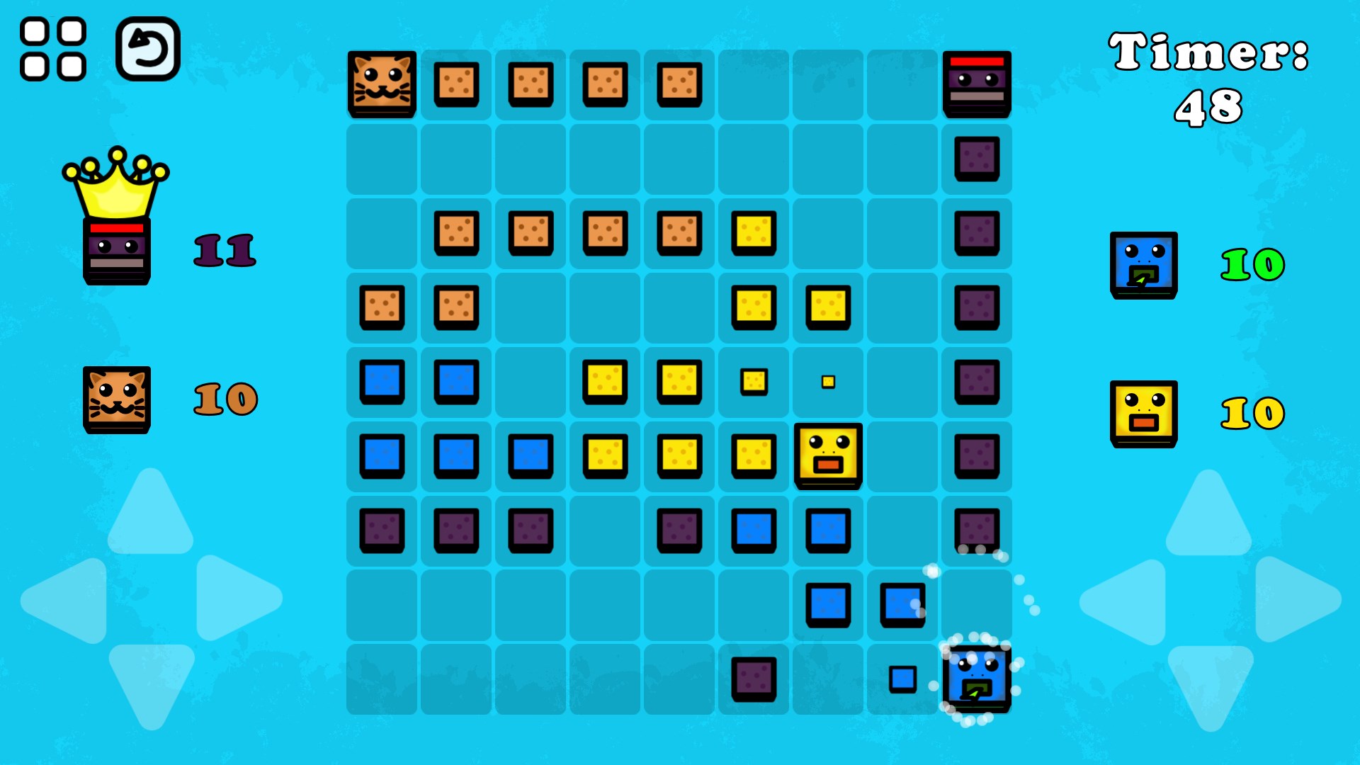 Pac-Blocks is a mini relaxing and casual game. You eat the enemy's blocks by moving and create your own blocks. The player with the most blocks at the end of the 1-minute countdown wins. If you tie the last one with the crown, you will be the winner. You can play against the computer or play with your friends. The game supports keyboards and gamepads.