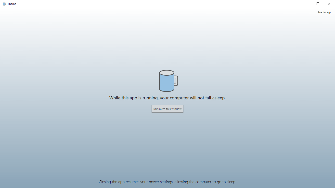 Start this app when you need to keep your computer awake, simply close it when your intensive task is done! While Theine runs, your PC will not go to sleep, nor will it go into hibernation mode.