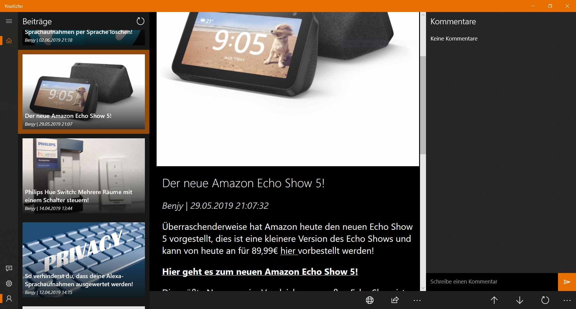 Mit der YourEcho.de App für Windows 10 bleibst du immer auf dem neusten Stand, wenn es um das Thema SmartHome und Alexa geht. Hier bekommst du regelmäßig unsere neusten News, Anleitungen, Testberichte und mehr direkt in einer für Windows 10 Geräte optimierten App!