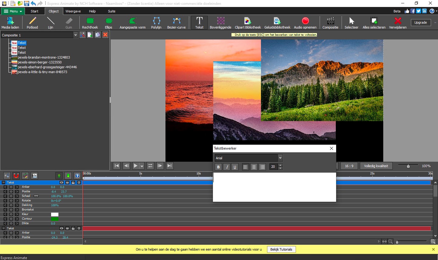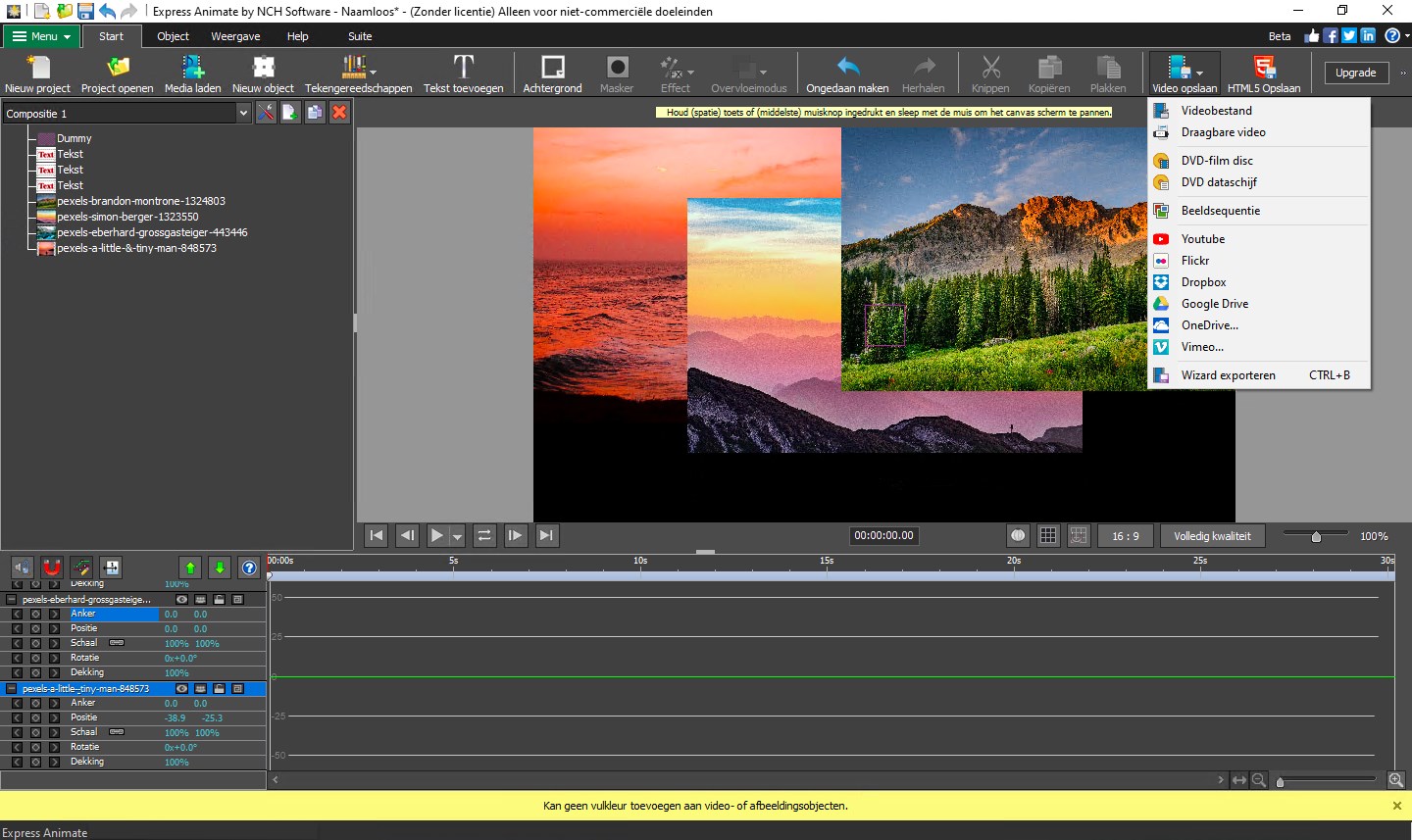 Begin vandaag met animaties maken met Express Animate animatiesoftware gratis. Breng illustraties tot leven of verbeter uw filmprojecten in post-productie met keyframe animatie. U kunt video's, afbeeldingen en tekst toevoegen in uw film canvas om het animatieproces te beginnen. De grootte van de objecten kunnen gemakkelijk worden aangepast of gedraaid en u kunt een brede scala aan effecten zoals de helderheid, contrast, negatief en meer toepassen.