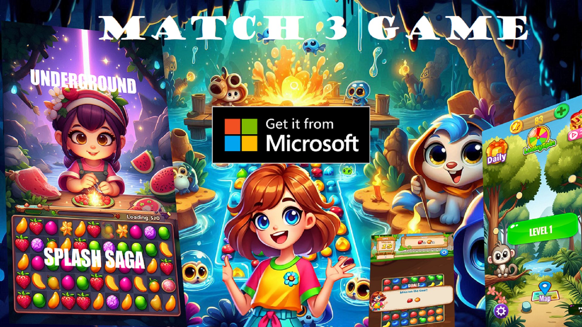 Welcome to Match 3 Games: Underground Splash popular Microsoft store game, the ultimate fruit-filled puzzle adventure! Embark on a journey through a tropical paradise where every level is packed with juicy challenges and delightful surprises. Your mission is simple—match three or more of the same fruits to splash them away and score points.