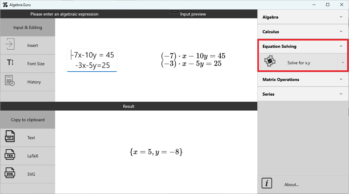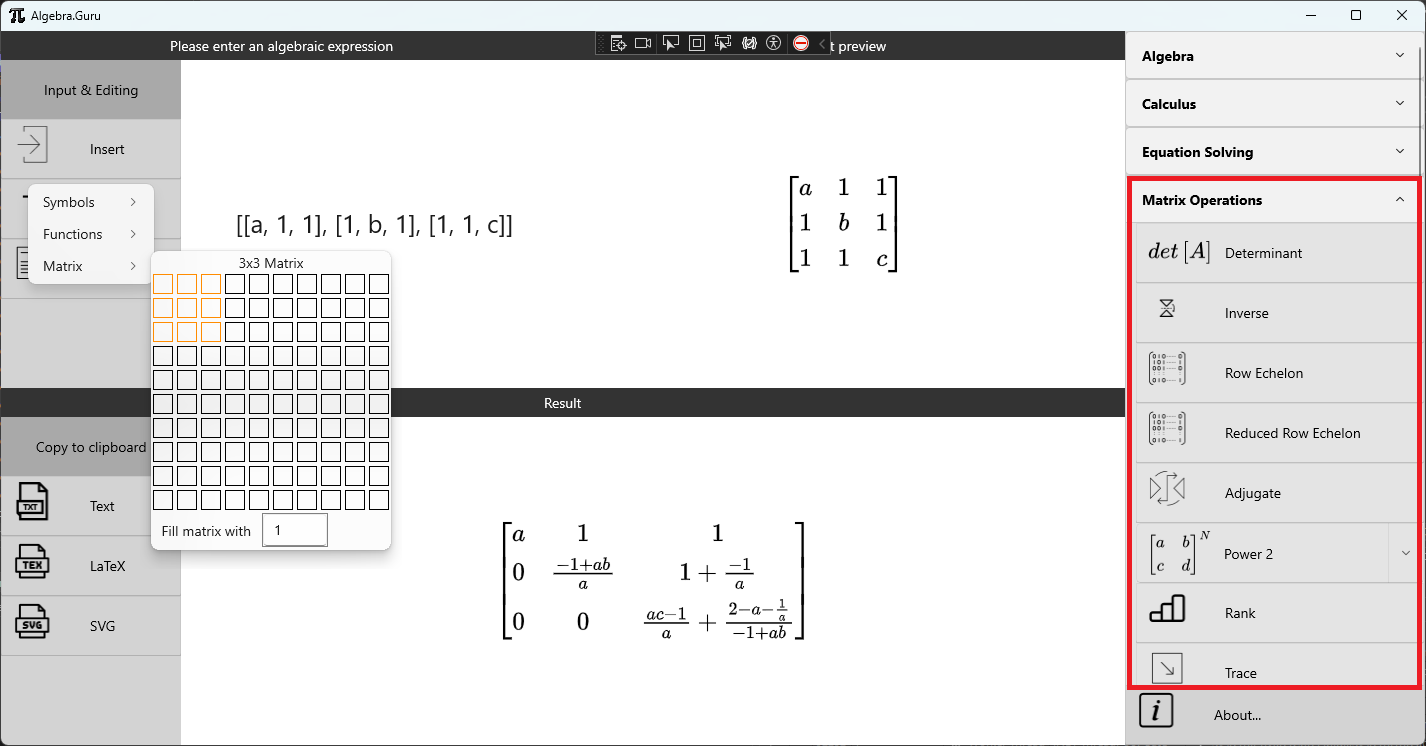 • Matrix Operations: Execute a range of matrix functions such as determinants, inverses, row echelon forms, adjugates, powers, ranks, and traces.