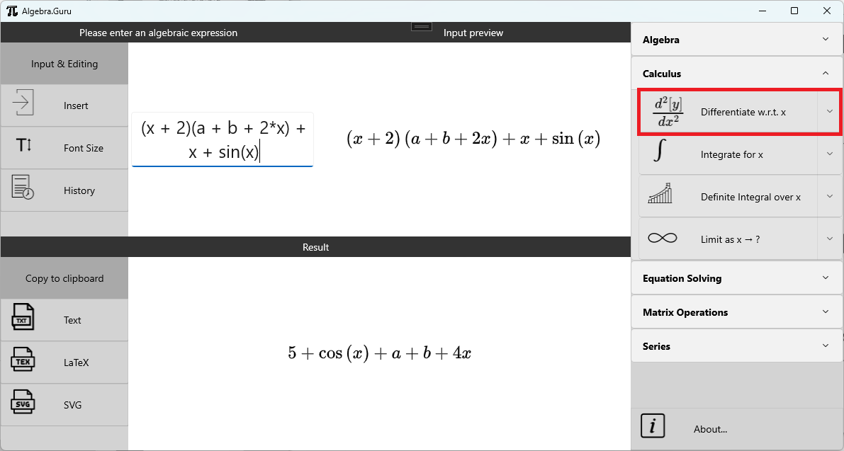 • Calculus: Differentiate and integrate with respect to any variable, compute definite integrals, and evaluate expression limits.