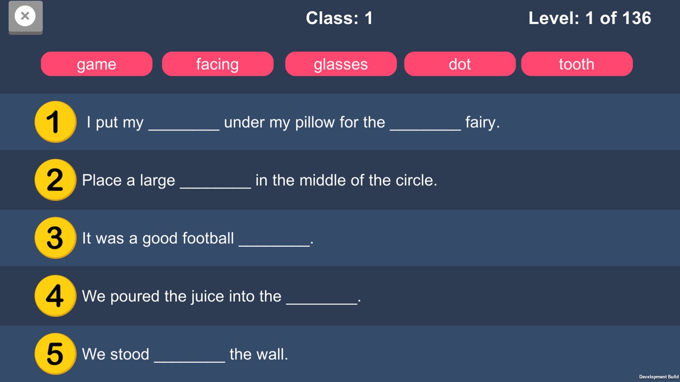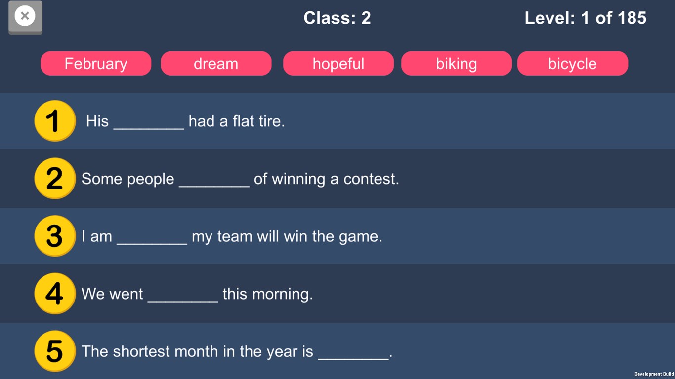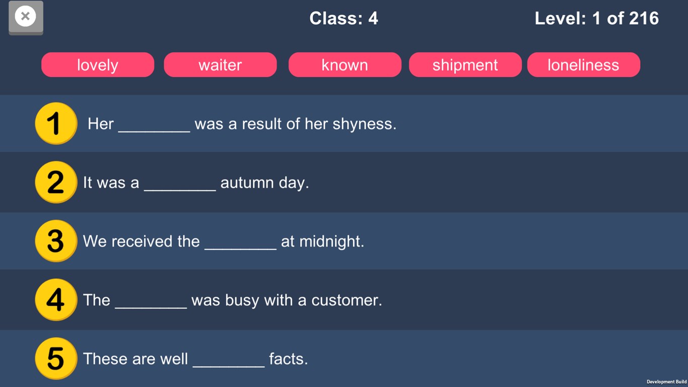You need to fill the words in to appropriate sentence. Once you fill the correct word it will show correct mark and once all sentences are completed it will move to next level.