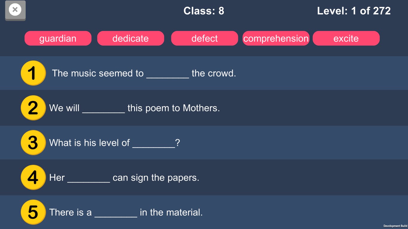 We have added 8 different classes with easy to hard level. There are 10,000 sentences are included. It also helps you to learn fill in the blanks. You learn how to use word grammatically in sentence.