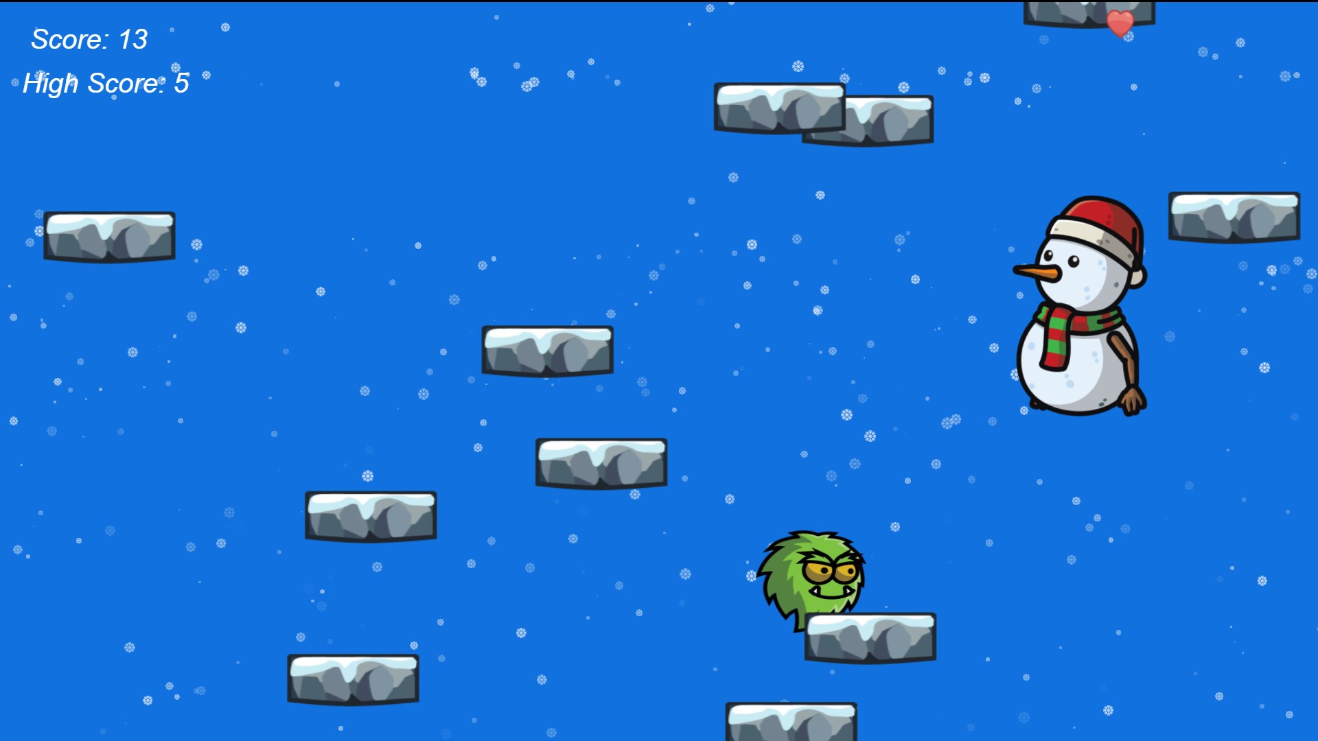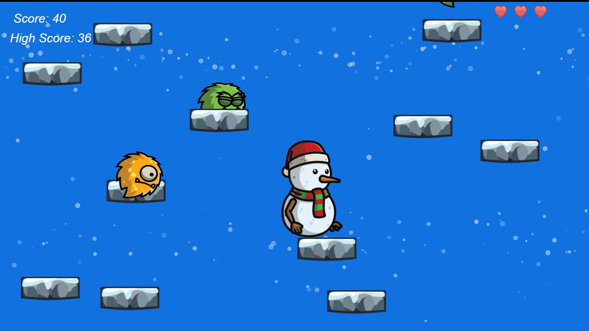 In Snowman Jump, the goal is to guide the Snowman up a never-ending series of platforms without falling or getting knocked out. Be careful there are many enemies that are trying to stop you. Throw Snowballs at the enemies to defeat them and gain more points and reach a new high score.