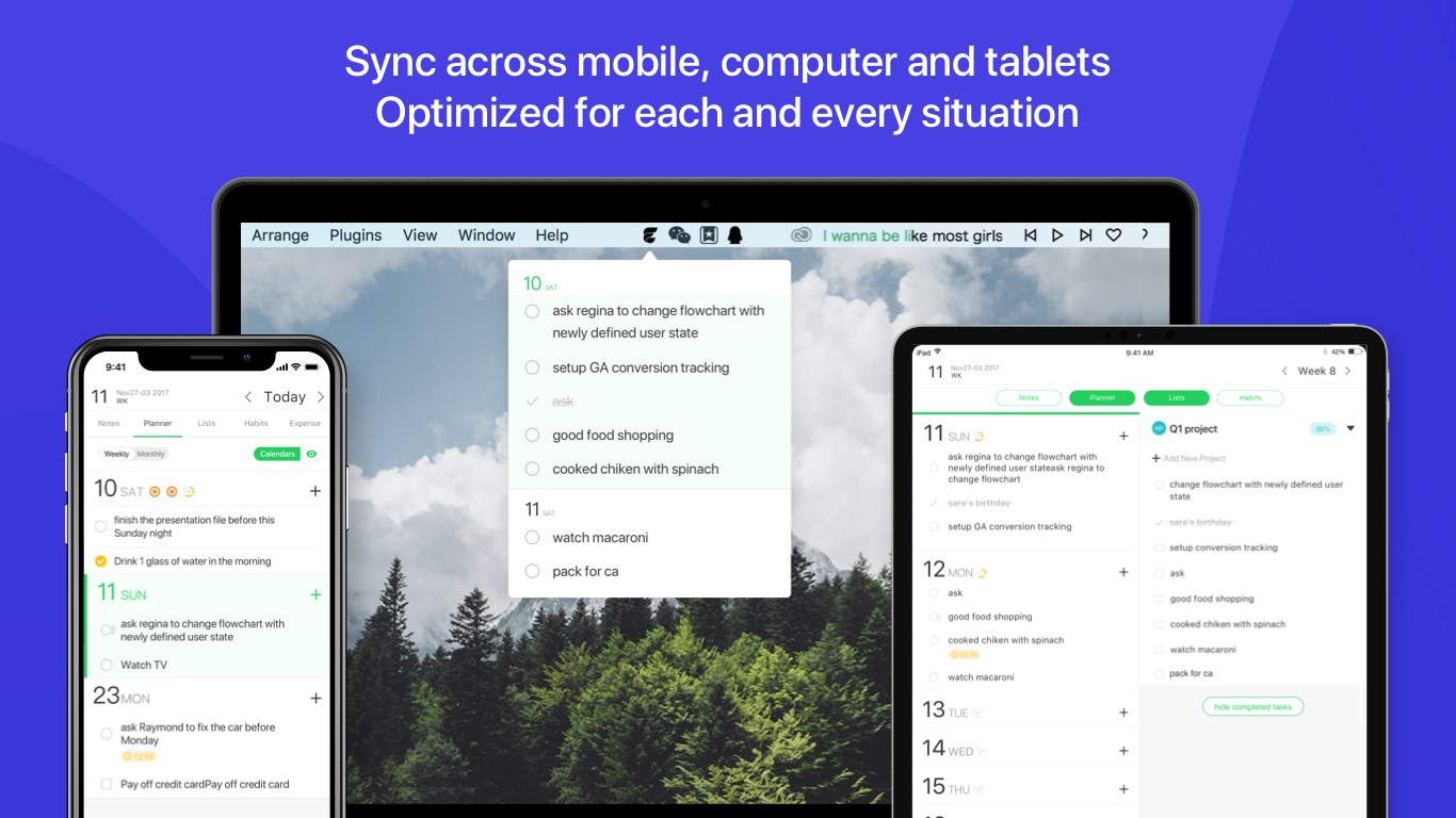 Elisi is available on all platforms, and everything syncs seamlessly together to the same account. You can plan on a big-screen computer and keep track from a mobile device.