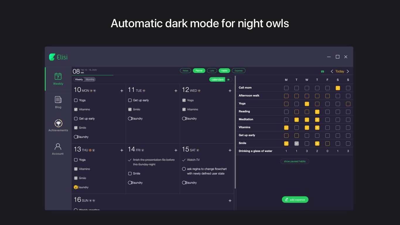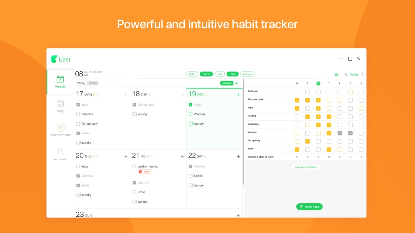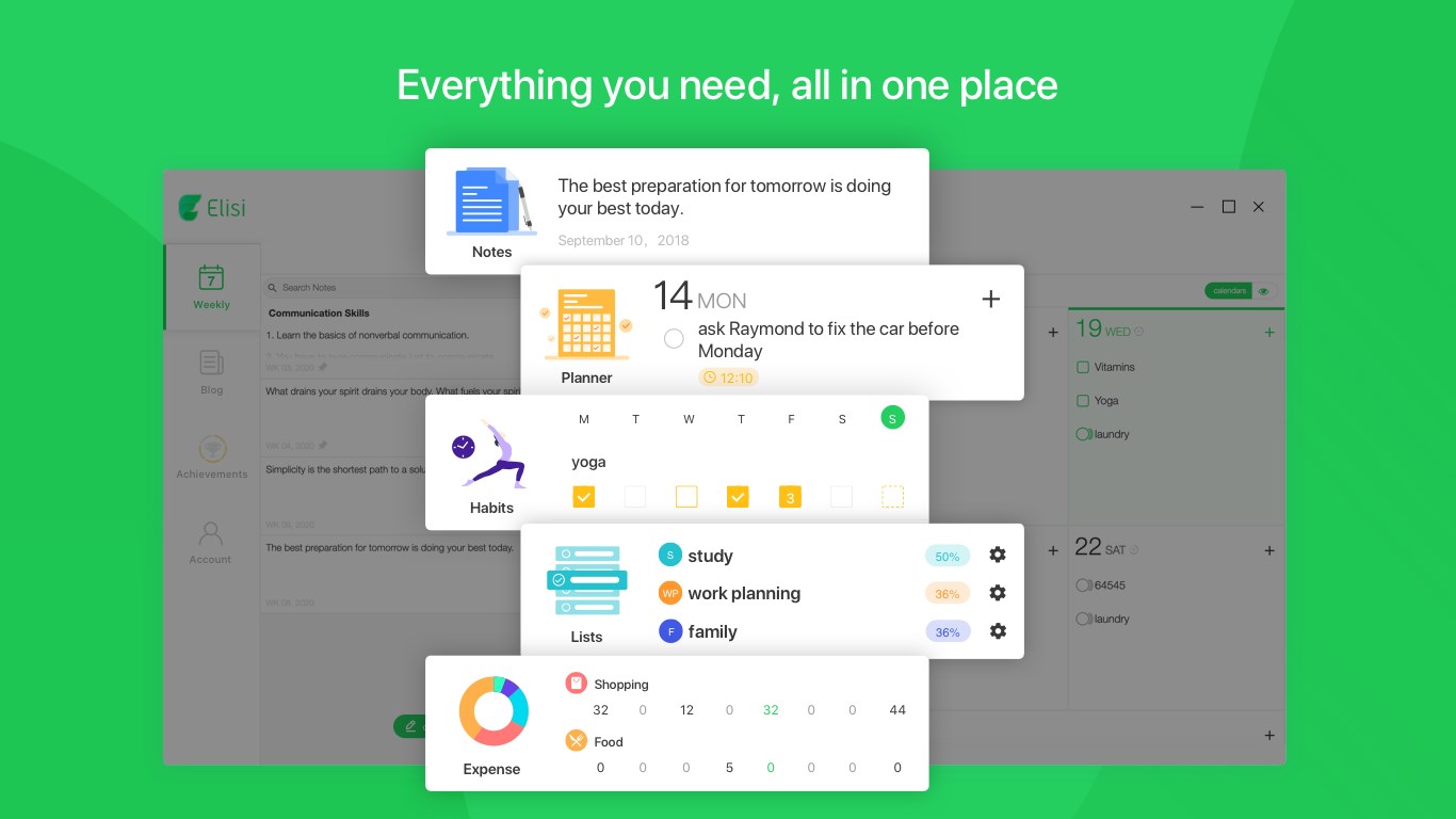 Elisi is your one-stop shop for productivity and personal achievement. View your whole week ahead, clearly laid out, all in one app: tasks to do, habits to keep track of, and the notes that you need. With its simple and intuitive UI, it’s easy to get organized and get on track with everything.