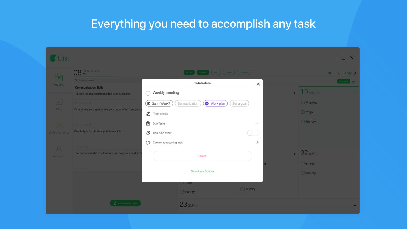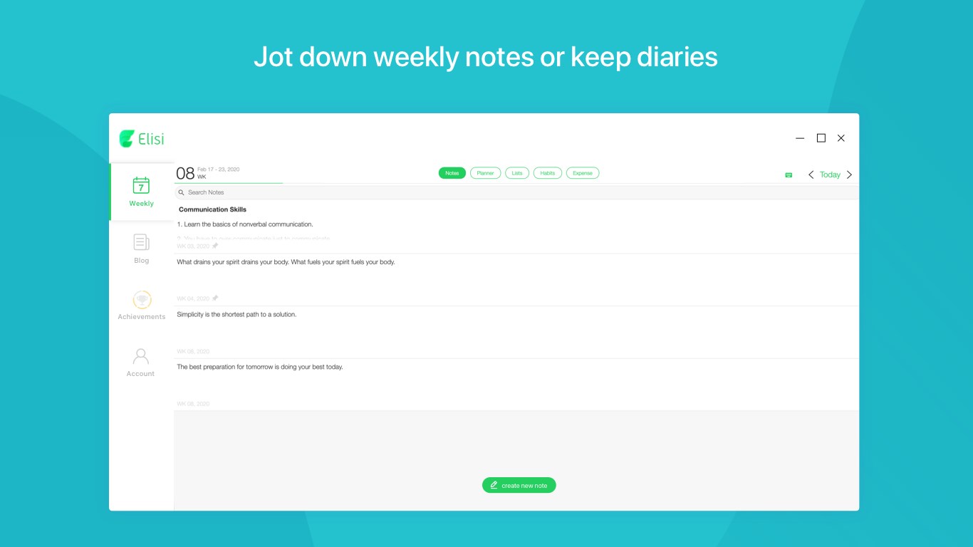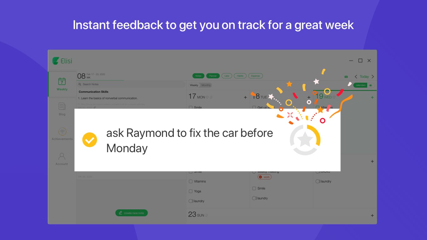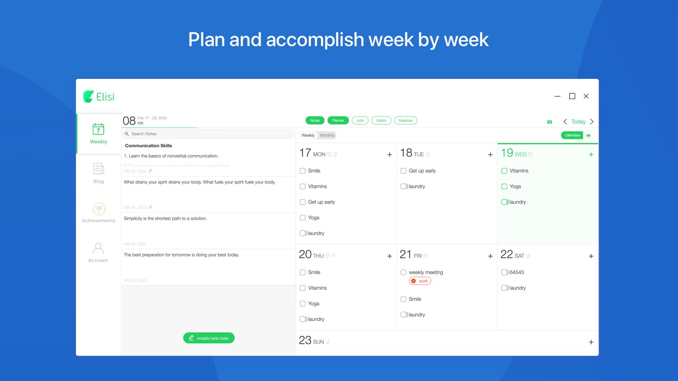 Elisi is your one-stop shop for productivity and personal achievement. View your whole week ahead, clearly laid out, all in one app: tasks to do, habits to keep track of, and the notes that you need. With its simple and intuitive UI, it’s easy to get organized and get on track with everything.