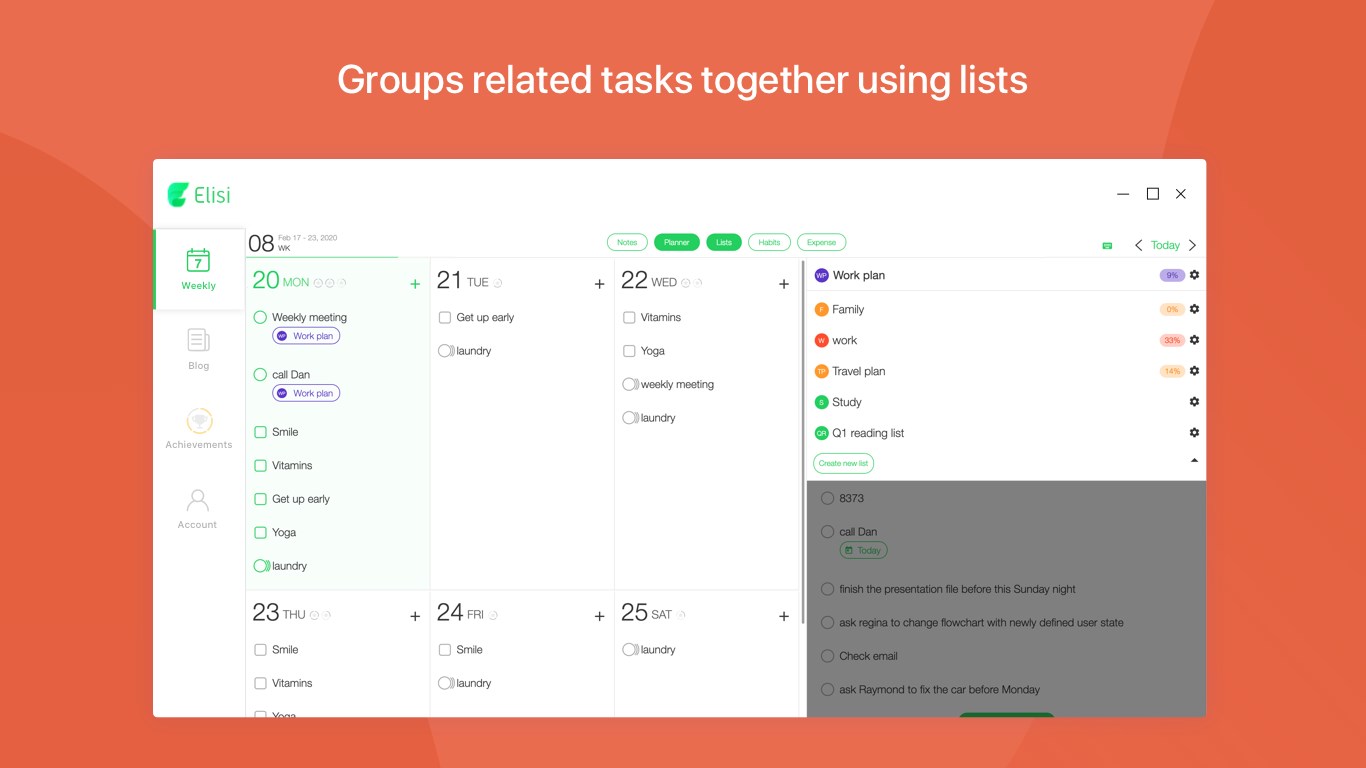 Group everything that’s related to the same goal, whether it's a habit, a list, a task, or notes. Goal mode turns Elisi into a tool that can help you in any of your long-term pursuits.