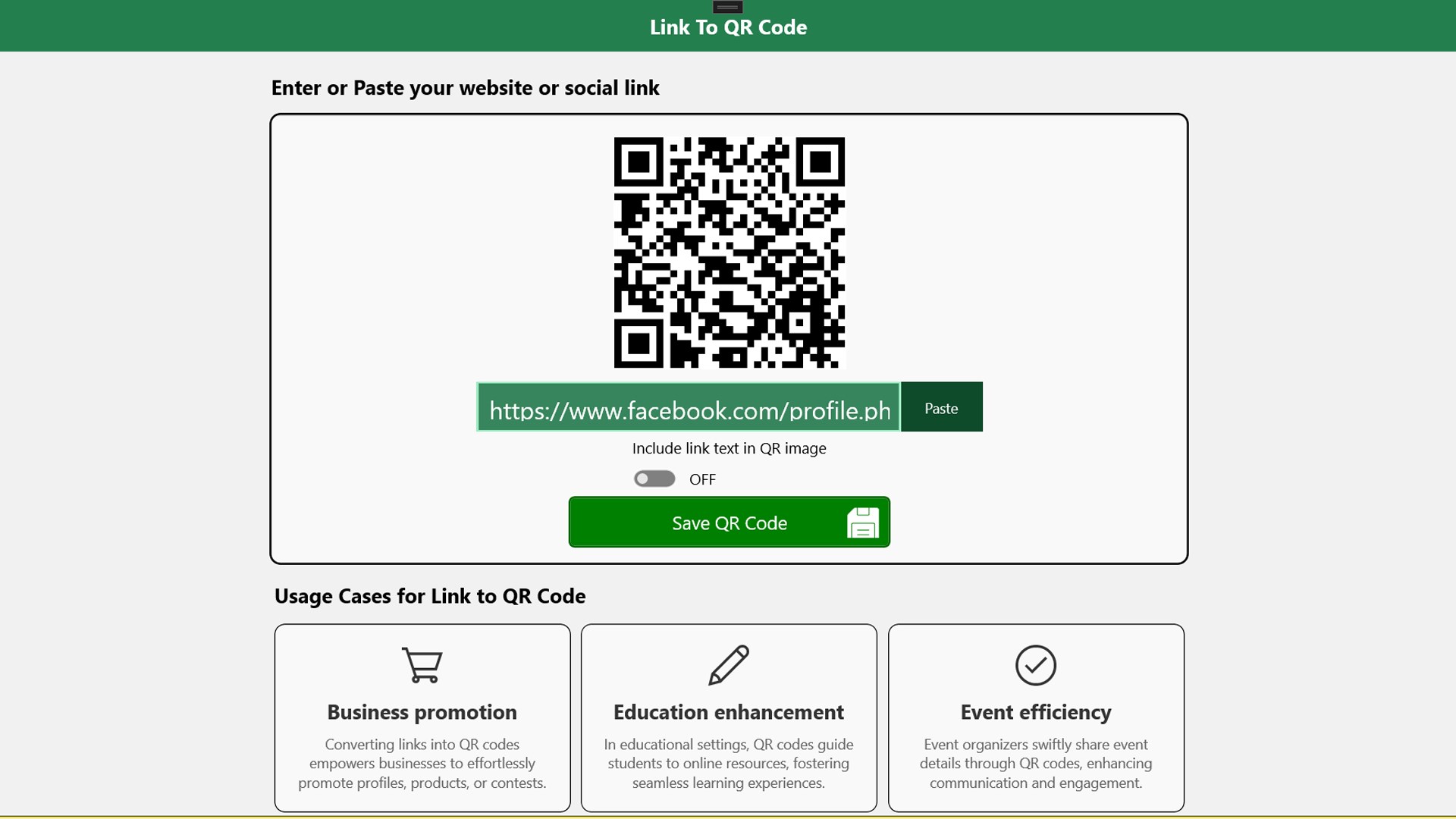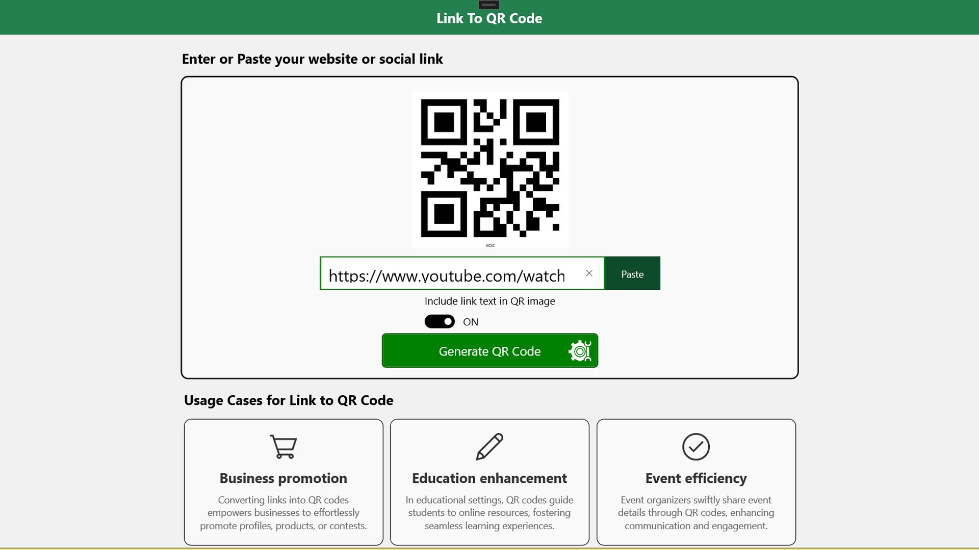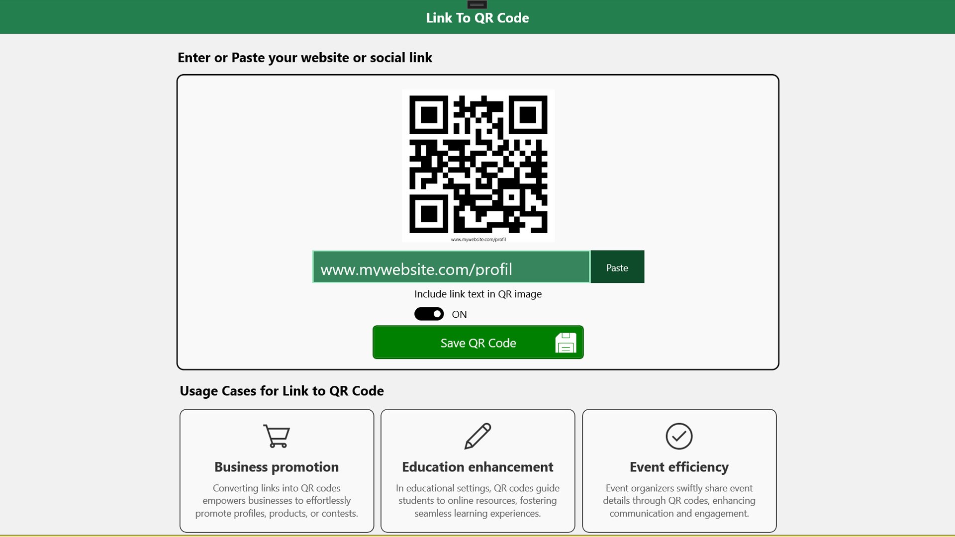 - User-Friendly Design: Designed for simplicity, making turning a link into a QR code effortless.