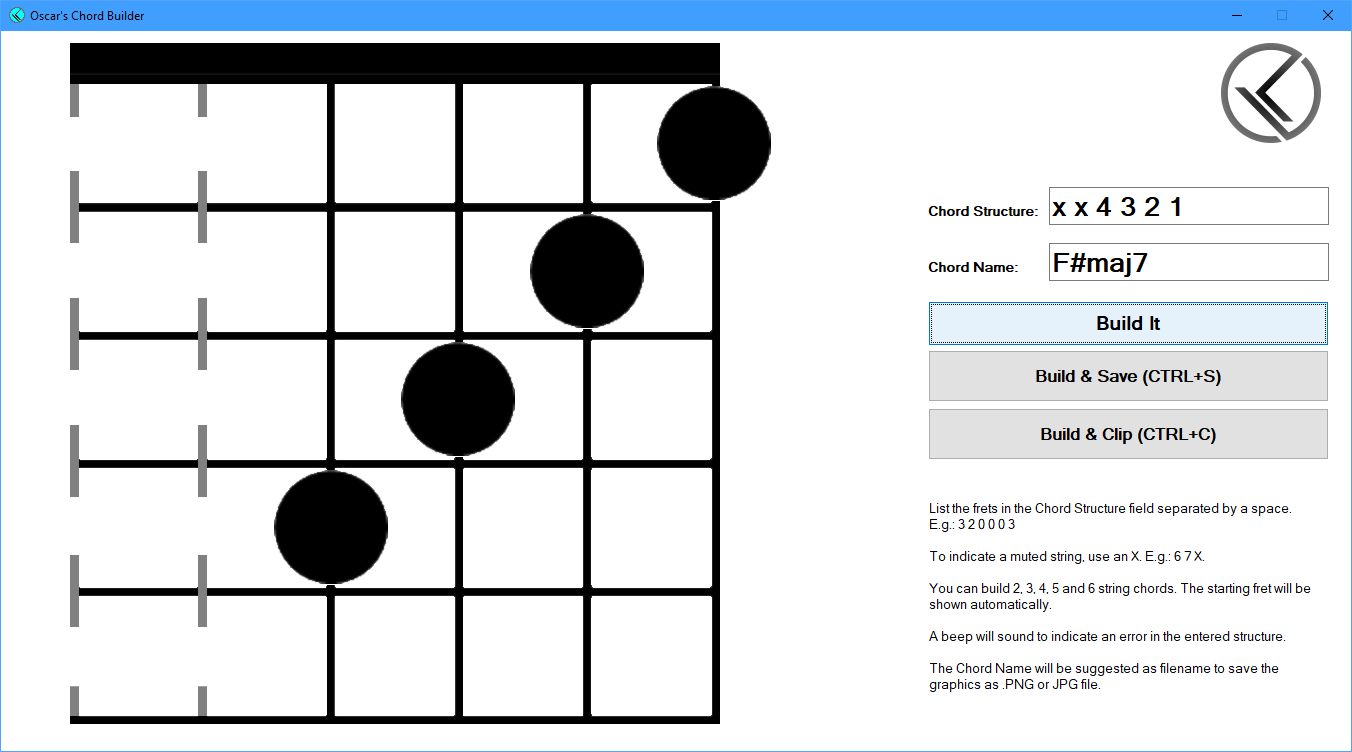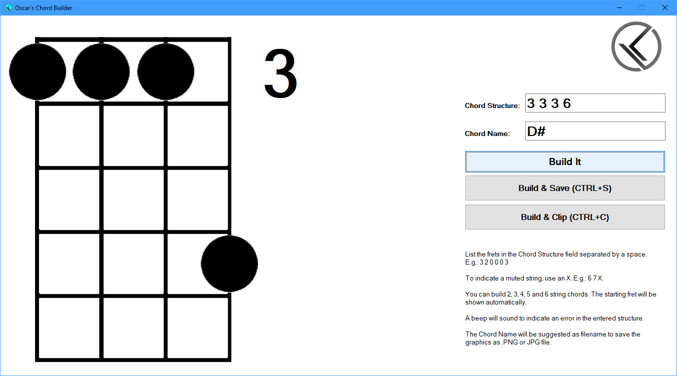 With Oscar's Chord Builder you can easily create images of 6, 5, 4, 3 and 2 string instrument chords. Simply enter the frets and click Build It.