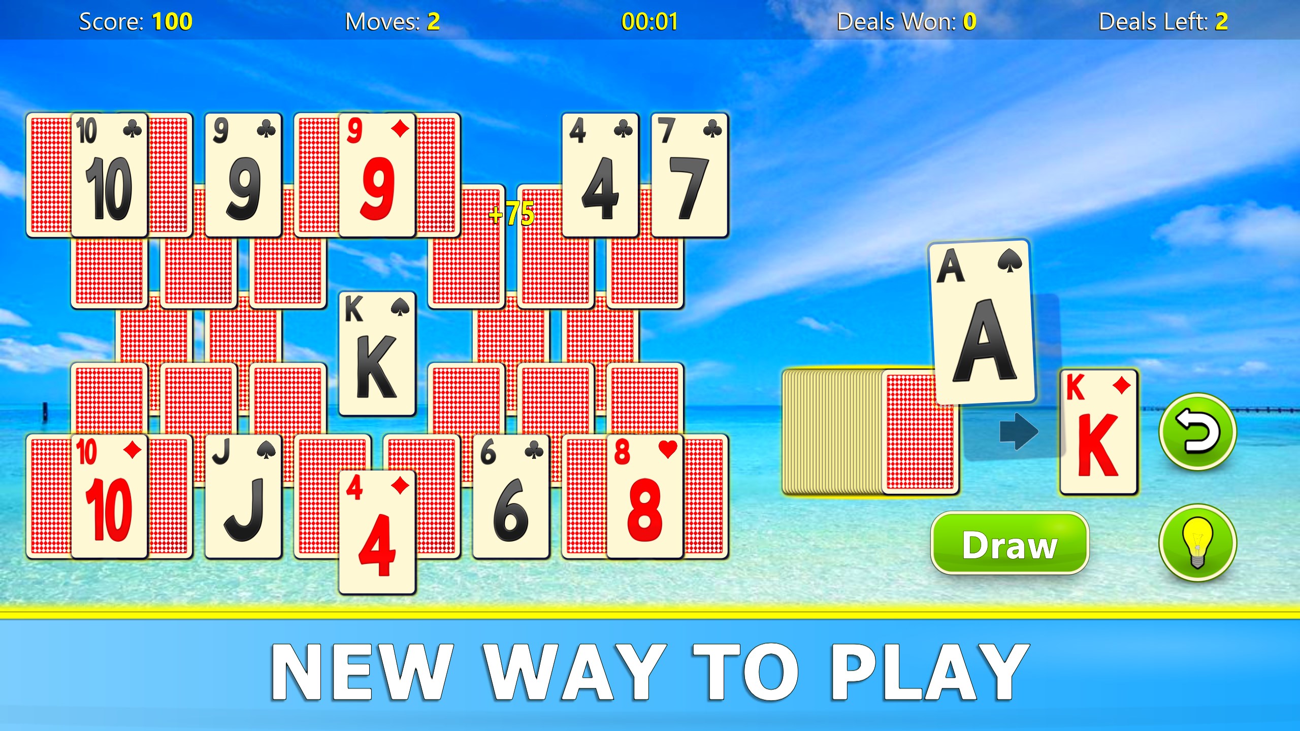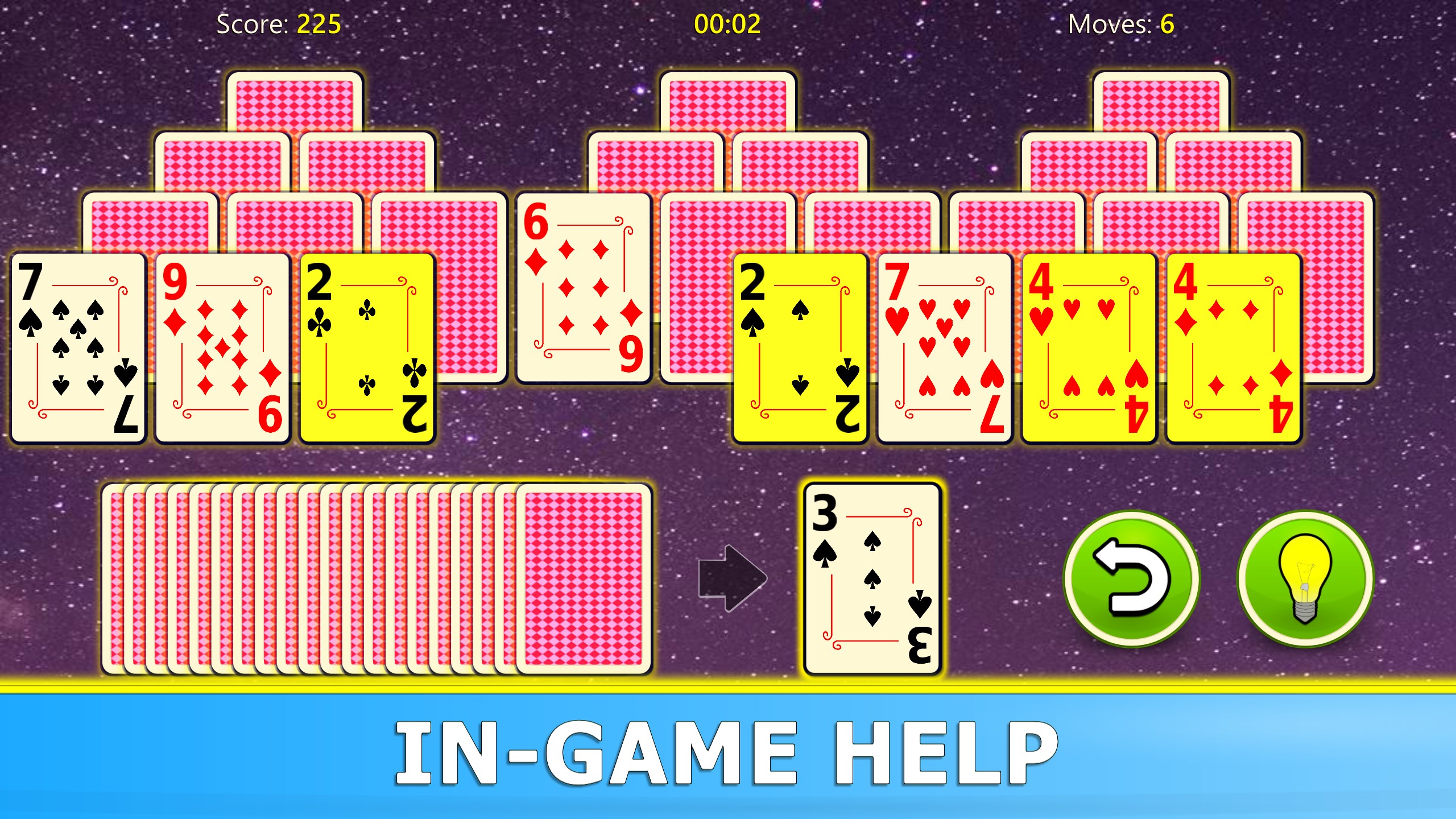 You start with a board of cards that form three pyramids. Over these three pyramids you will find ten exposed cards and at the bottom you will find a deck of cards and a waste pile. The goal of the game is to clear as many boards as possible by tapping cards from the board that is one lower or one higher than the one in the waste pile. You can match any uncovered card.