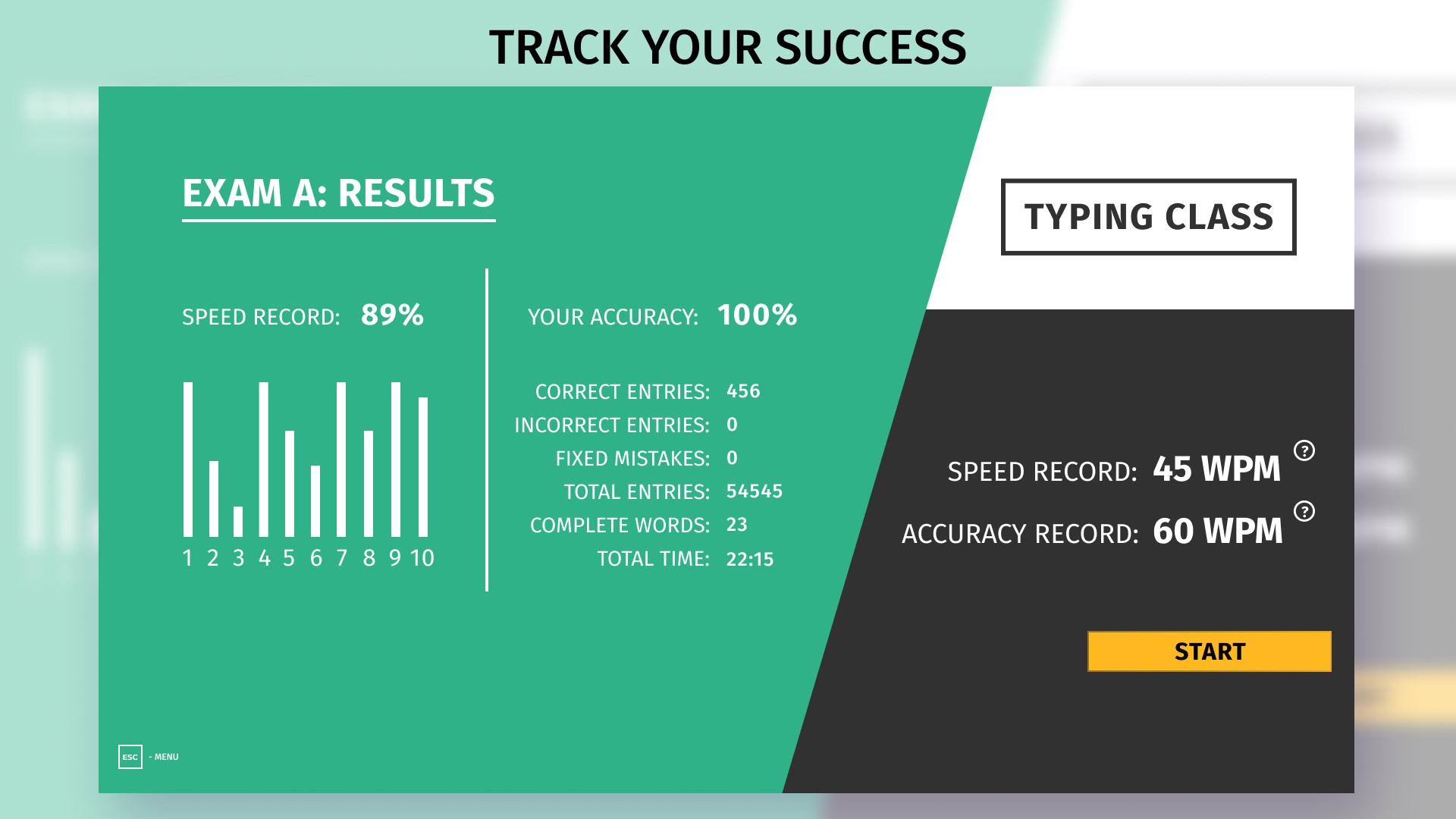 Elaborated system of training for any level. Start with basic exercises that train every finger separately and progress to typing texts with both hands. Train your accuracy and speed, then test your skills in exam mode.