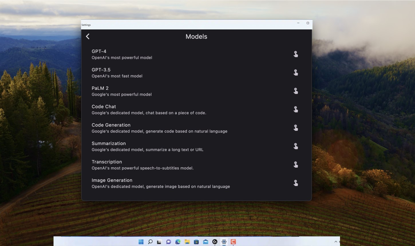 GPT-4/OpenAI, PaLM 2/Google, Code Chat, Code Generation, Image Generation, Transcription, Summarization, etc