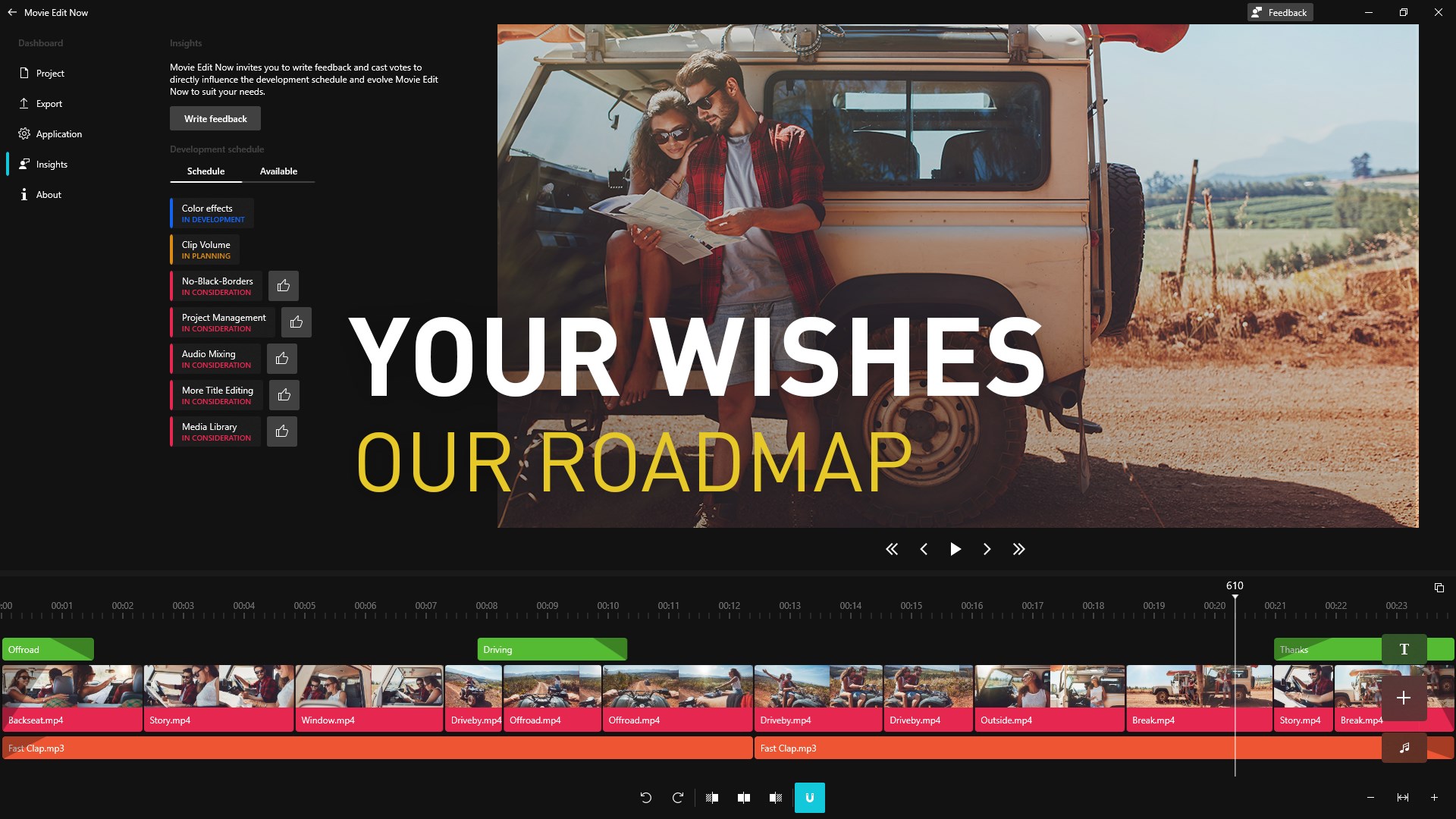 - Direct insights into the user-driven development schedule of all available video editing features and what we plan to add