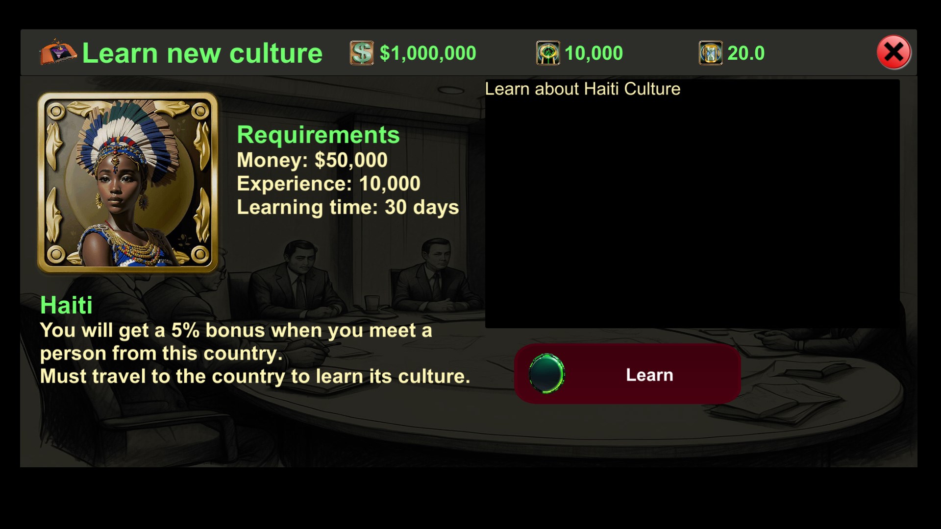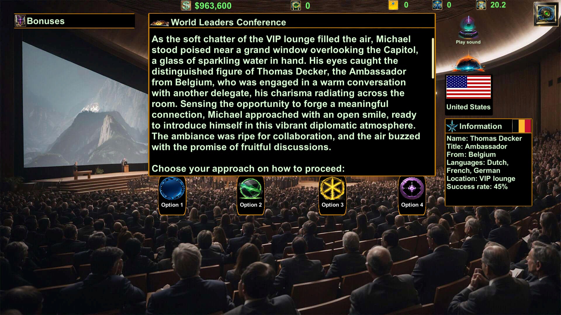 180 Cultures: Explore diverse cultures from around the world, understand others better, and learn to accept differences.60 Languages: Learn new languages and improve your communication with leading figures.29 Diplomat Skills: Master various diplomatic skills to succeed in missions.15 Technologies: Leverage diplomat advanced technologies to gain an edge.25 Futuristic Developments: Implement innovative futuristic developments by your firm.59 Mission Types: Engage in diverse missions that impact country relations, economies, security, and happiness.11 Conference Types: Meet high-level attendees and complete unique missions to earn rewards.