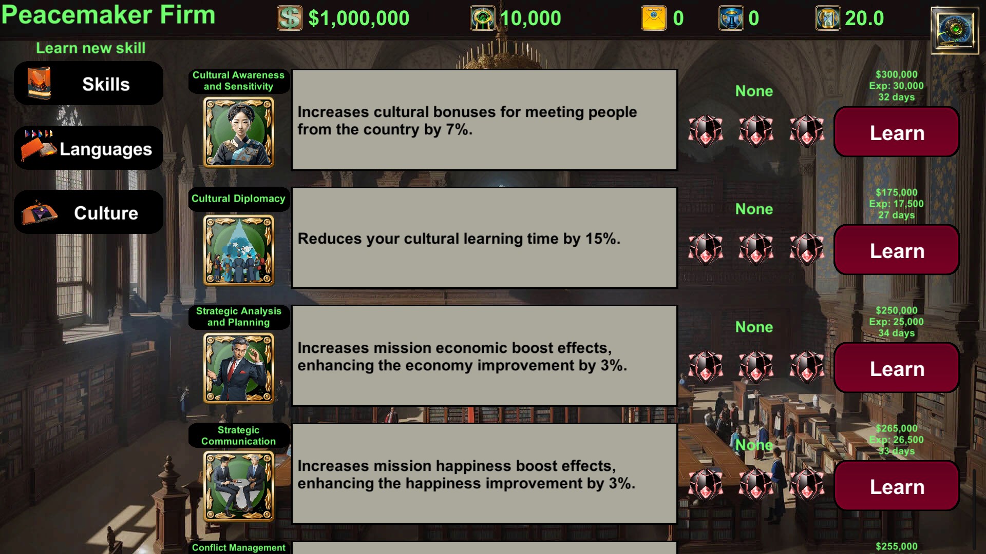 29 Diplomat Skills: Master various diplomatic skills to succeed in missions.