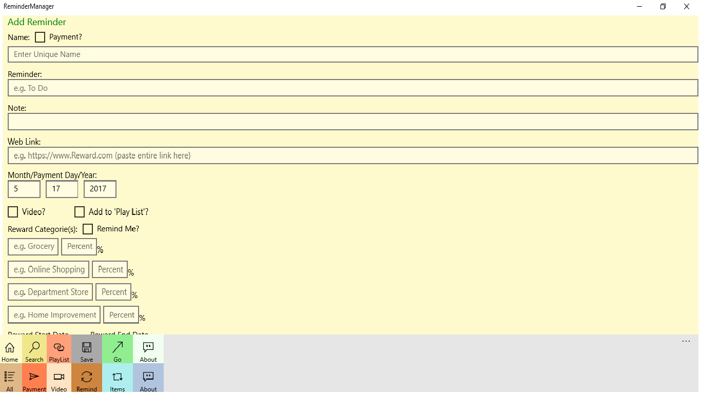 Create your own Reminder(s) or Goal(s), few build in Reminder Manager Cortana voice commands including Reward Reminder, Any Coming Payments to show you the list. You will also get toast notification or live tile for how many items in the list. Supporting Window 10 Universal Windows Platform (UWP).