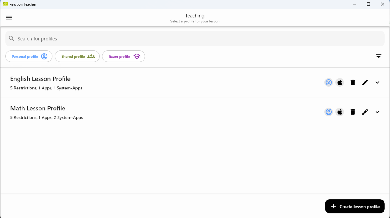 Relution Teacher supports teachers in delivering chaos-free lessons with tablets. Lesson-specific profiles can be created and pre-configured to be used directly in the classroom. With just a few clicks, settings are applied to student devices: apps and web links relevant to the lesson appear automatically, and features that are not needed are disabled. Outside of class, all device functions and apps are available again.