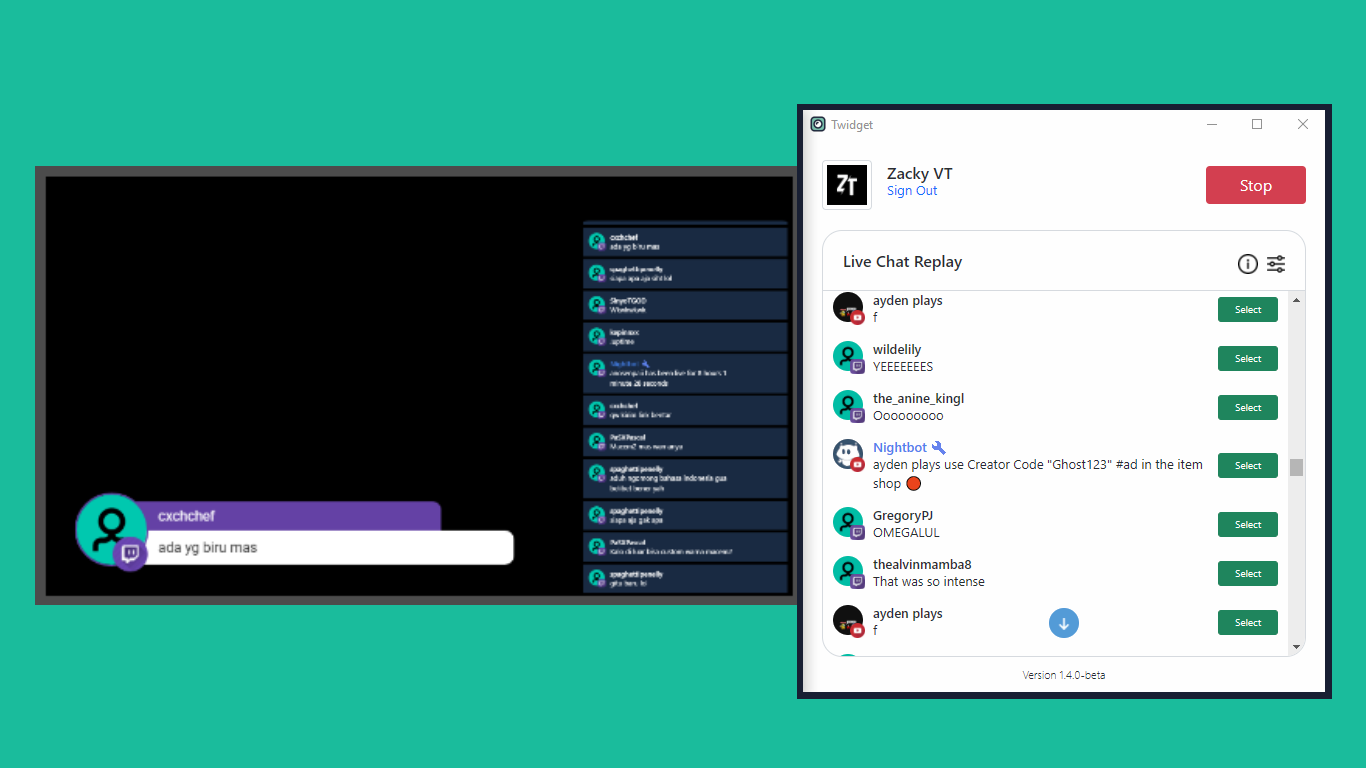 Using Twidget is very easy! Just launch the app and sign in with their Google account. Open Streamlabs/OBS and create a new browser source with the URL of "localhost:3000/source". Click the Start button in the app, and paste your Livestream URLs. Watch your chat box populate with chat messages where you can select and unselect them. Done! Your selected chat messages will appear in the stream!
