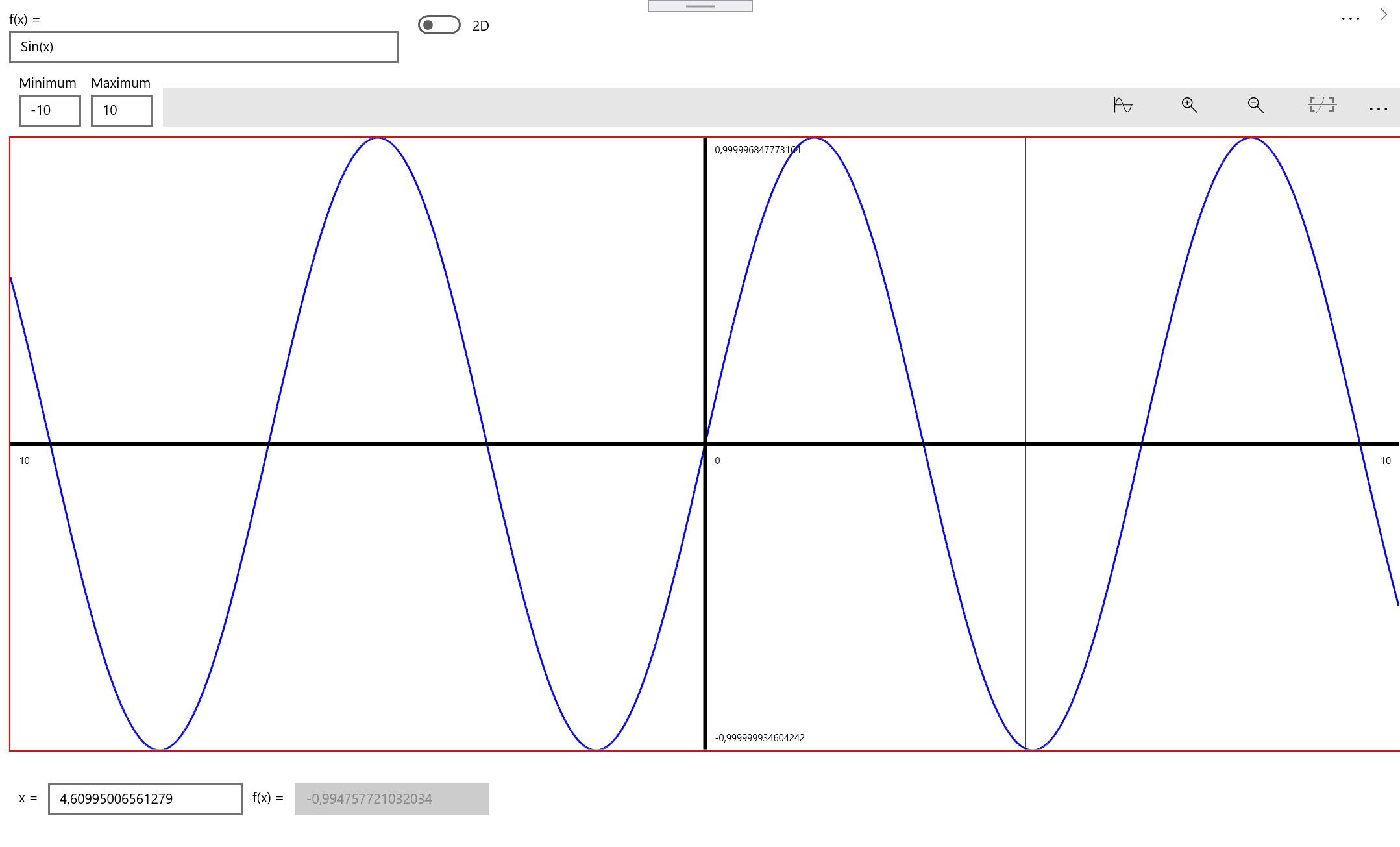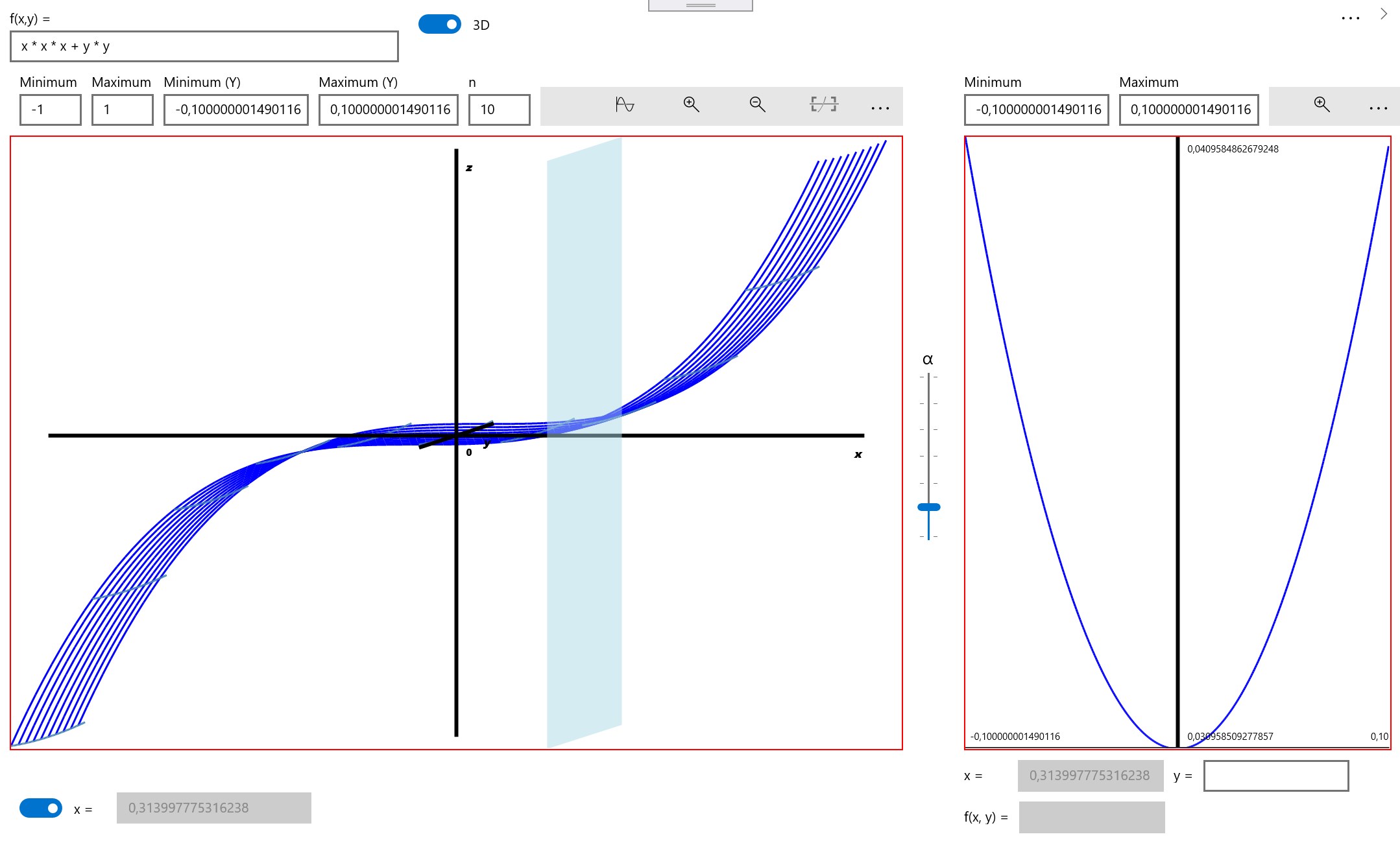 GraphPlotter is a simple app to plot 2-dimensional or 3-dimensional graphs of mathematical functions such as: Sin(x), Sin(x)+Sin(y), Pow(x,2).