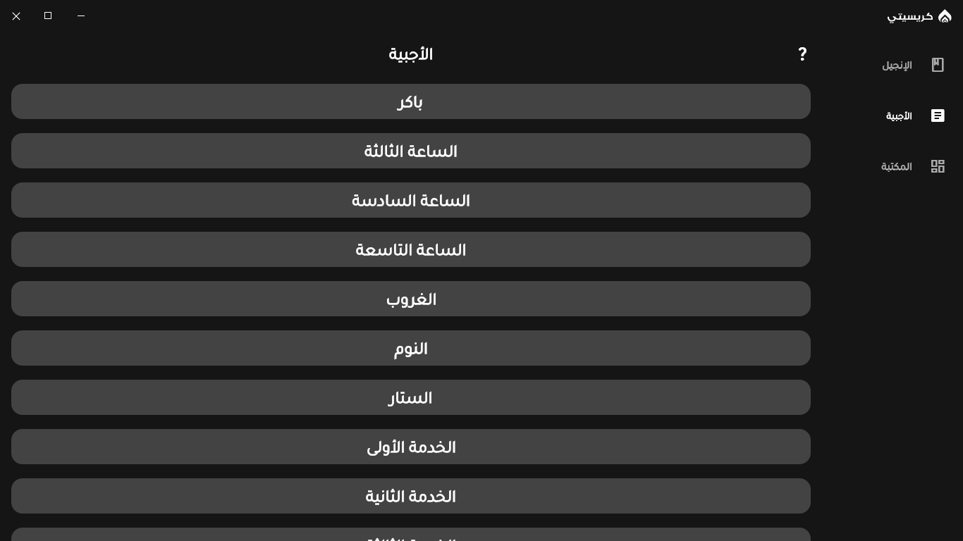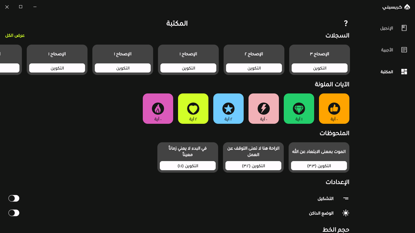 الإنجيل المسموعتفسير الإنجيلالأجبيةكتابة ملحوظاتتلوين الآياتالنسخ الأحتياطيالتنقل السريعتقسيم الآياتاختصارات لوحة المفاتيحالعرض بتشكيل او بدونالوضع الداكننسخ المحتوىتغيير حجم الخطسجل التحركات