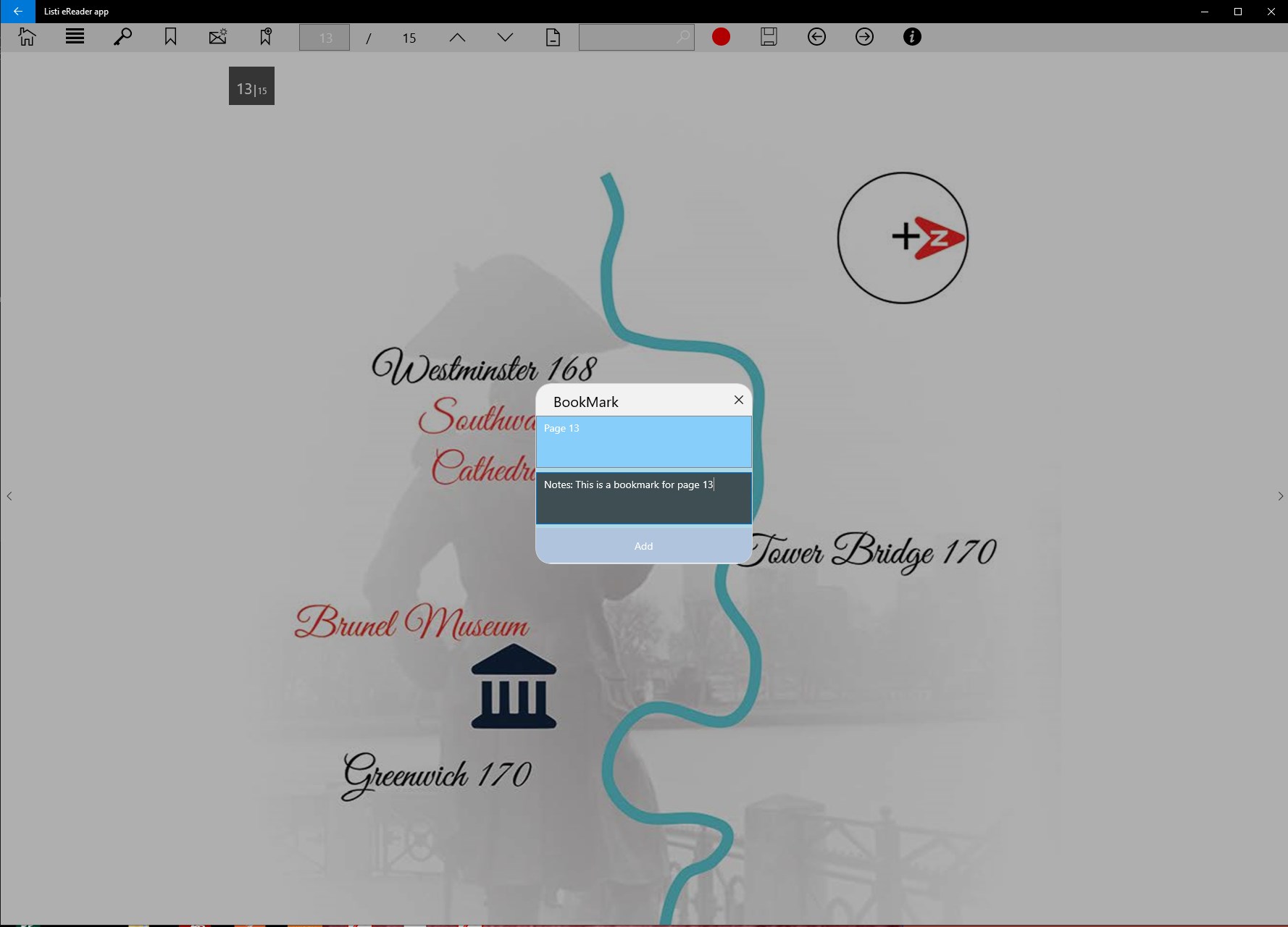 The eReader allows the customer to view the book , add bookmarks and add grouped bookmarks to the application.