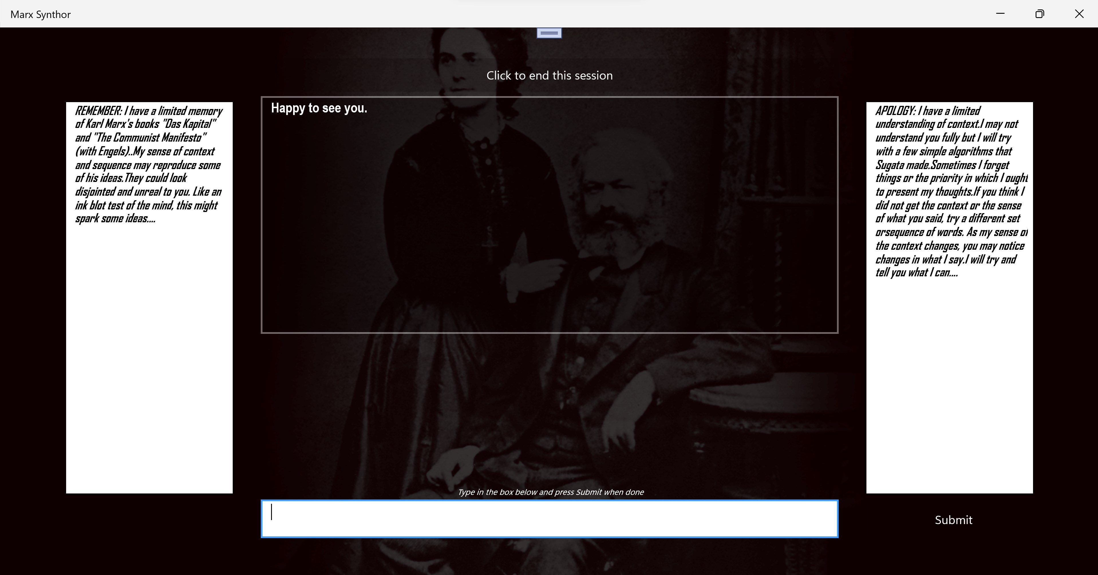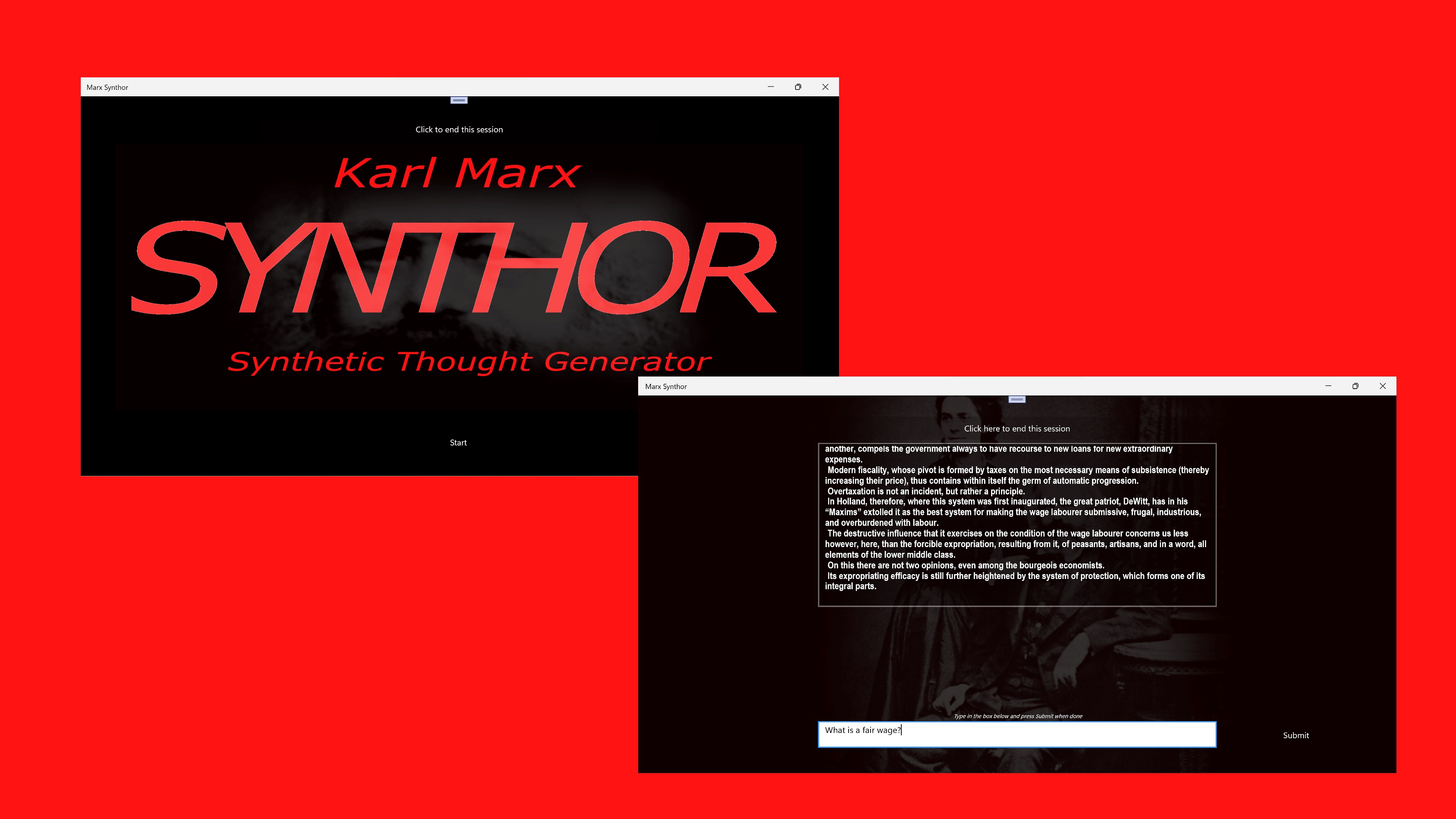 This is a Synthor made from Karl Marx's books, "The Communist Manifesto" (written with Engels) and "Das Kapital", two of the most influential books of all time. Marx's critical theories about society, economics, and politics, collectively understood as Marxism, hold that human societies develop through class conflict. Marx has been described as one of the most influential figures in human history, and his work has been both lauded and criticised. His work in economics laid the basis for some current theories about labour and its relation to capital. Most people have heard of him but few have actually read his books.