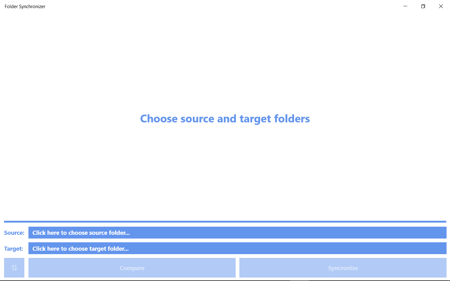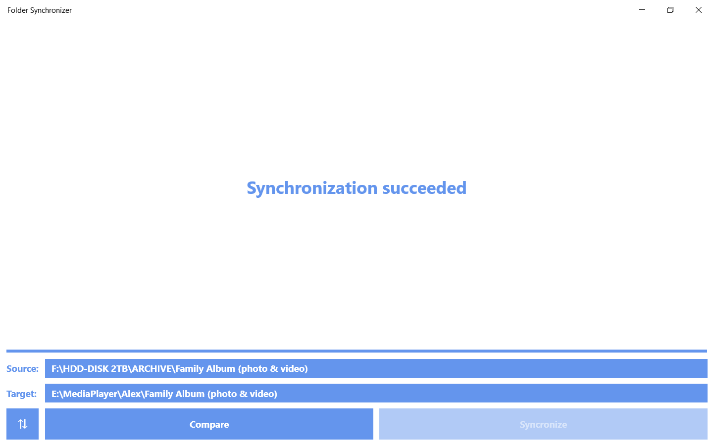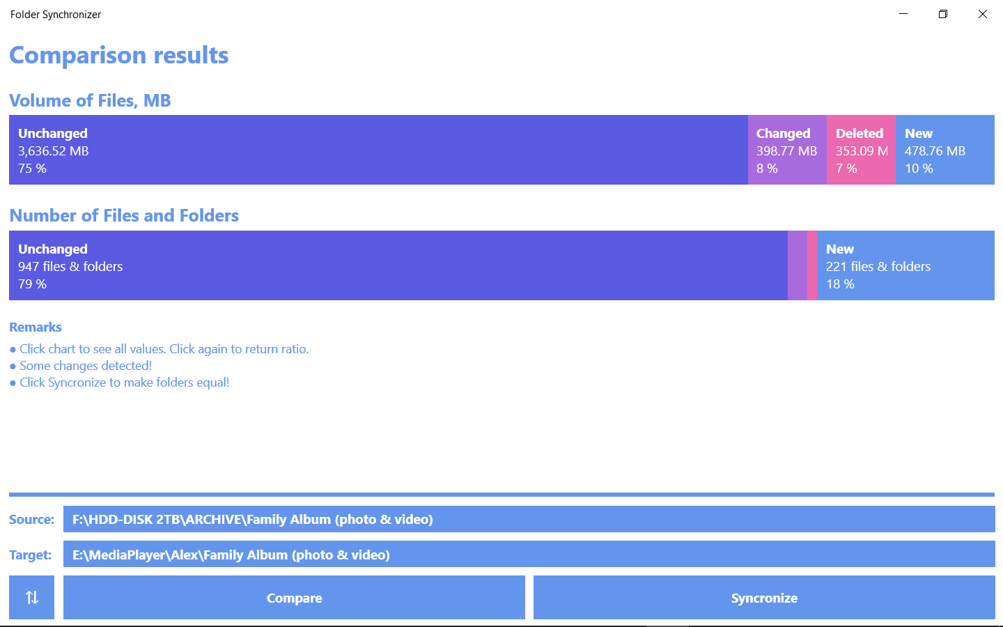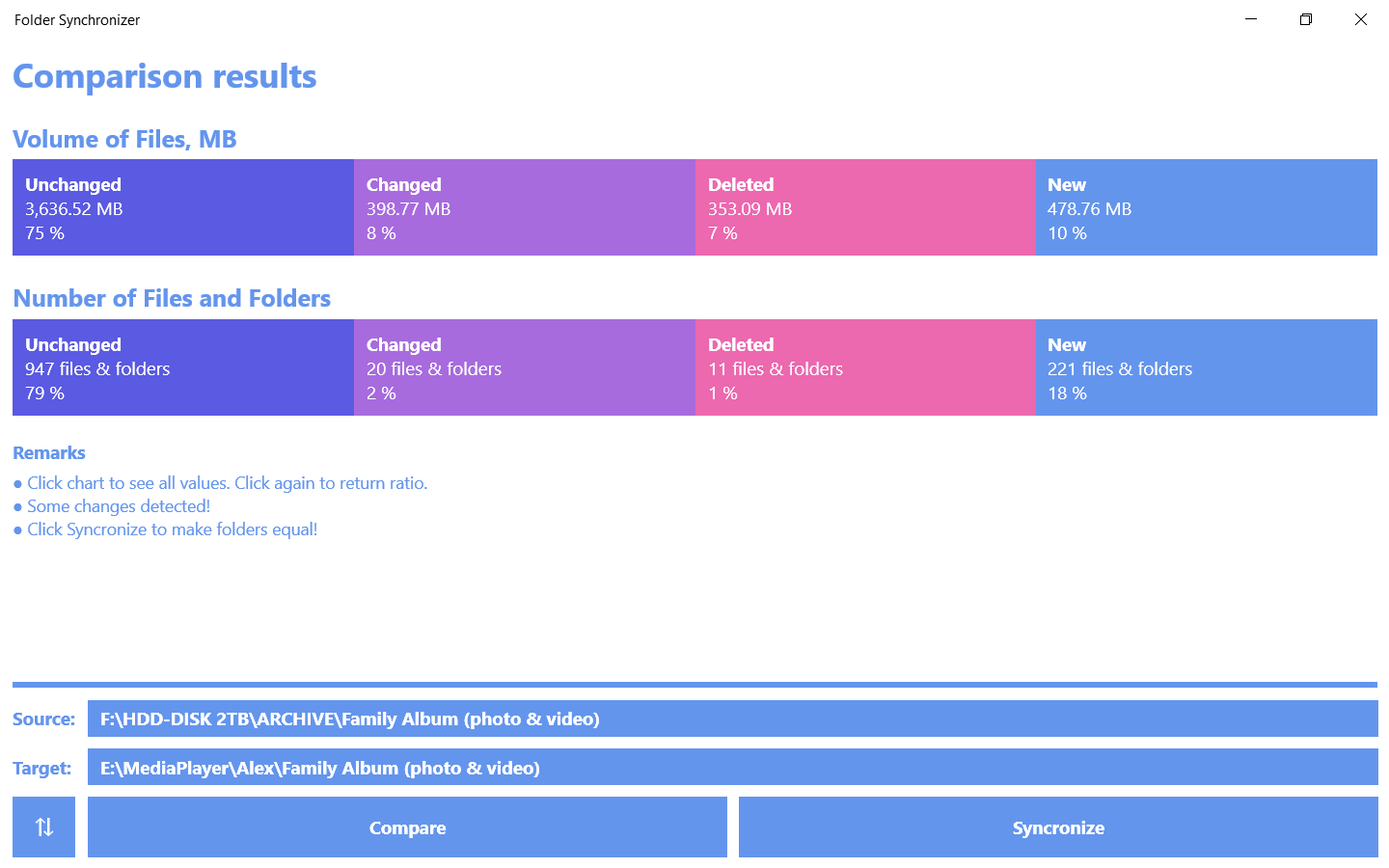 Compares two folders.Displays the differences statistic.Makes the target folder equal to the source folder.