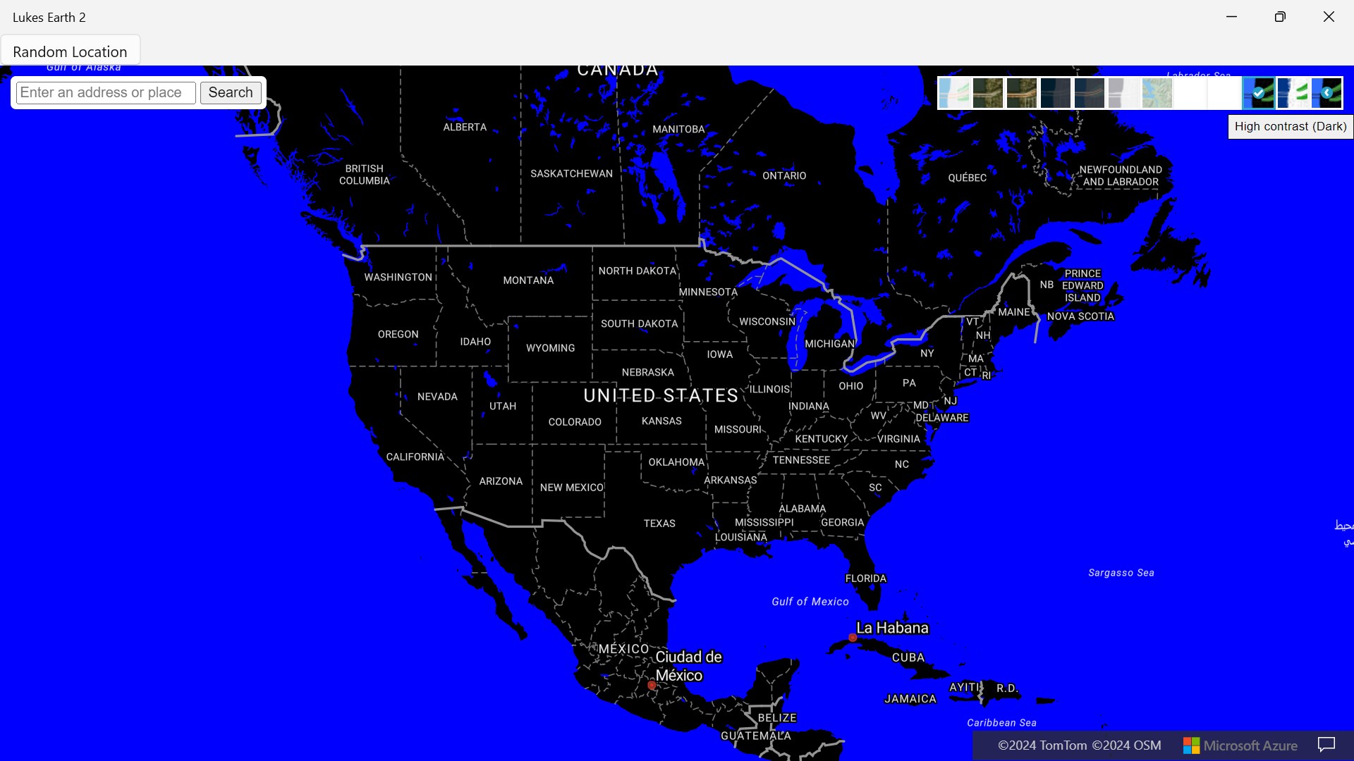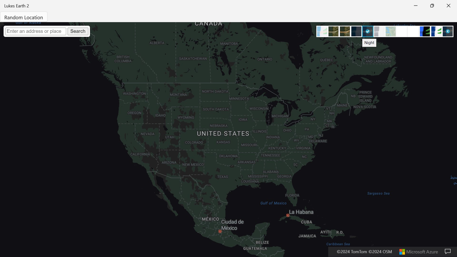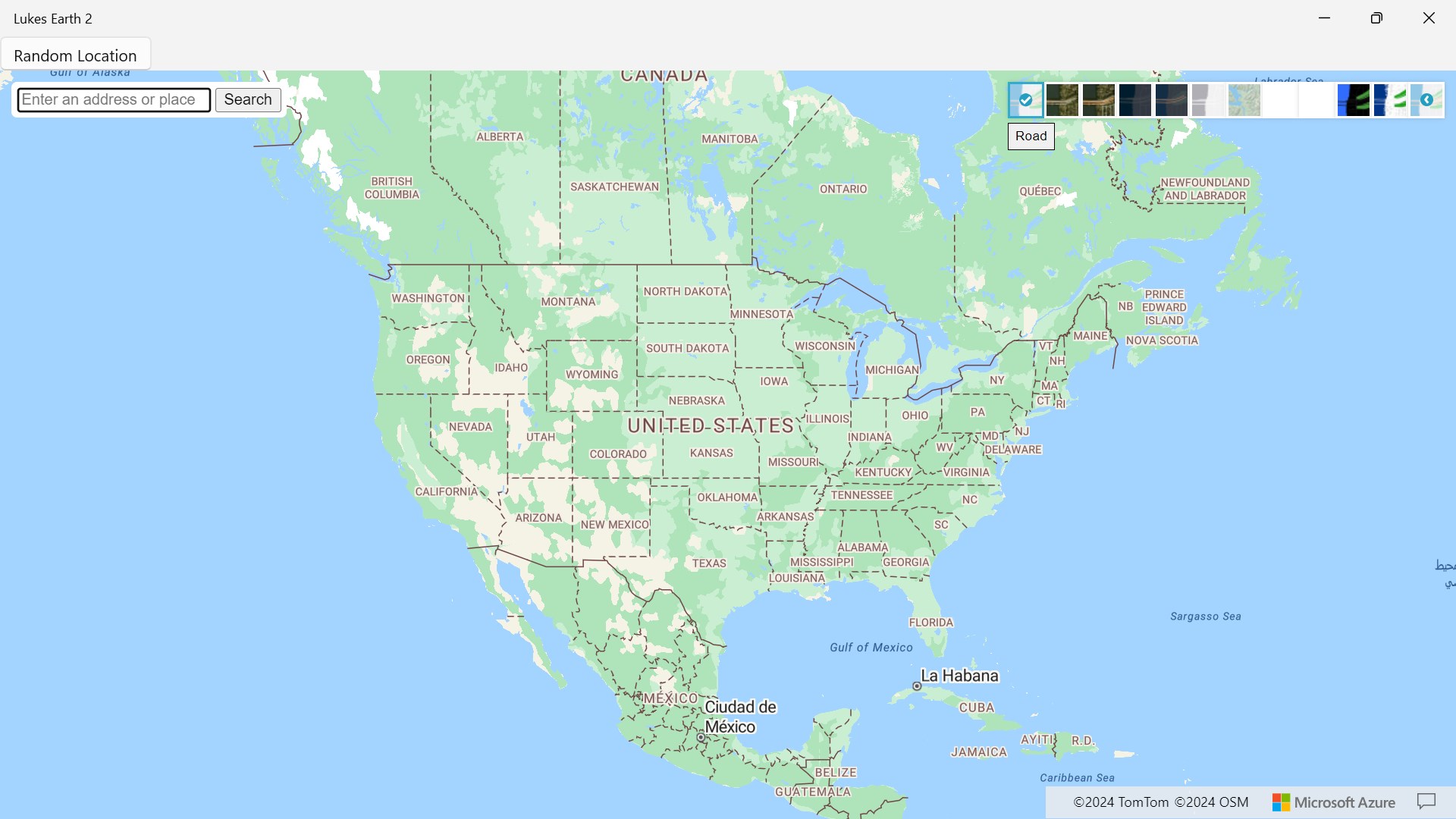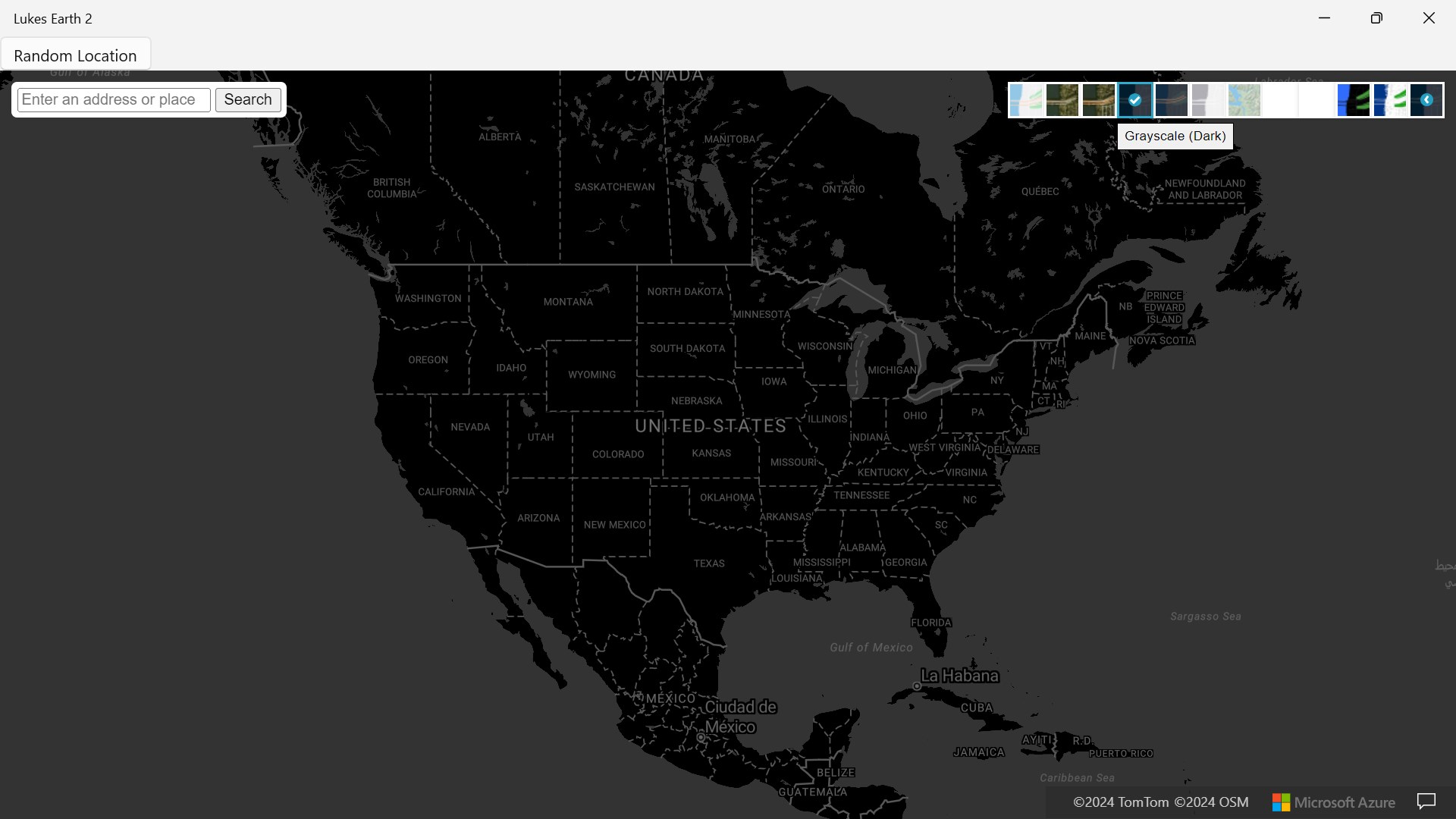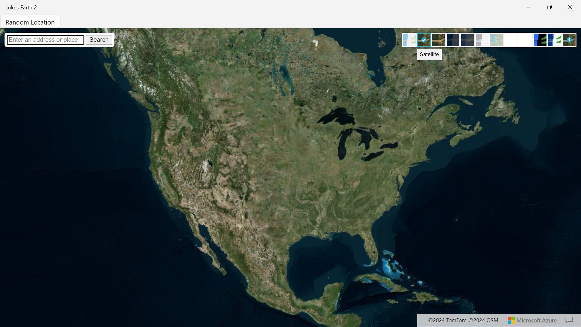 Lukes Earth 2 is a computer program that renders a 3D representation of Earth based primarily on satellite imagery. The program maps the Earth by superimposing satellite images, aerial photography data from azure maps, allowing users to see cities and landscapes from various angles click on top right hand corner on arrow to change select style it has a search bar search anywhere in the world it has different styles like Road, Satellite, Hybrid, Grayscale (Dark), Night, Grayscale (Light), Terra, Blank, HighContrastDark, HighContrastLight and a random location button