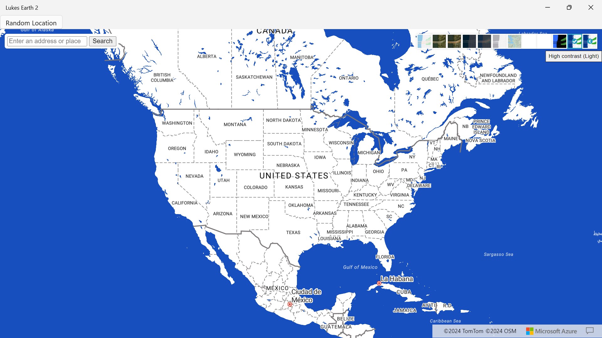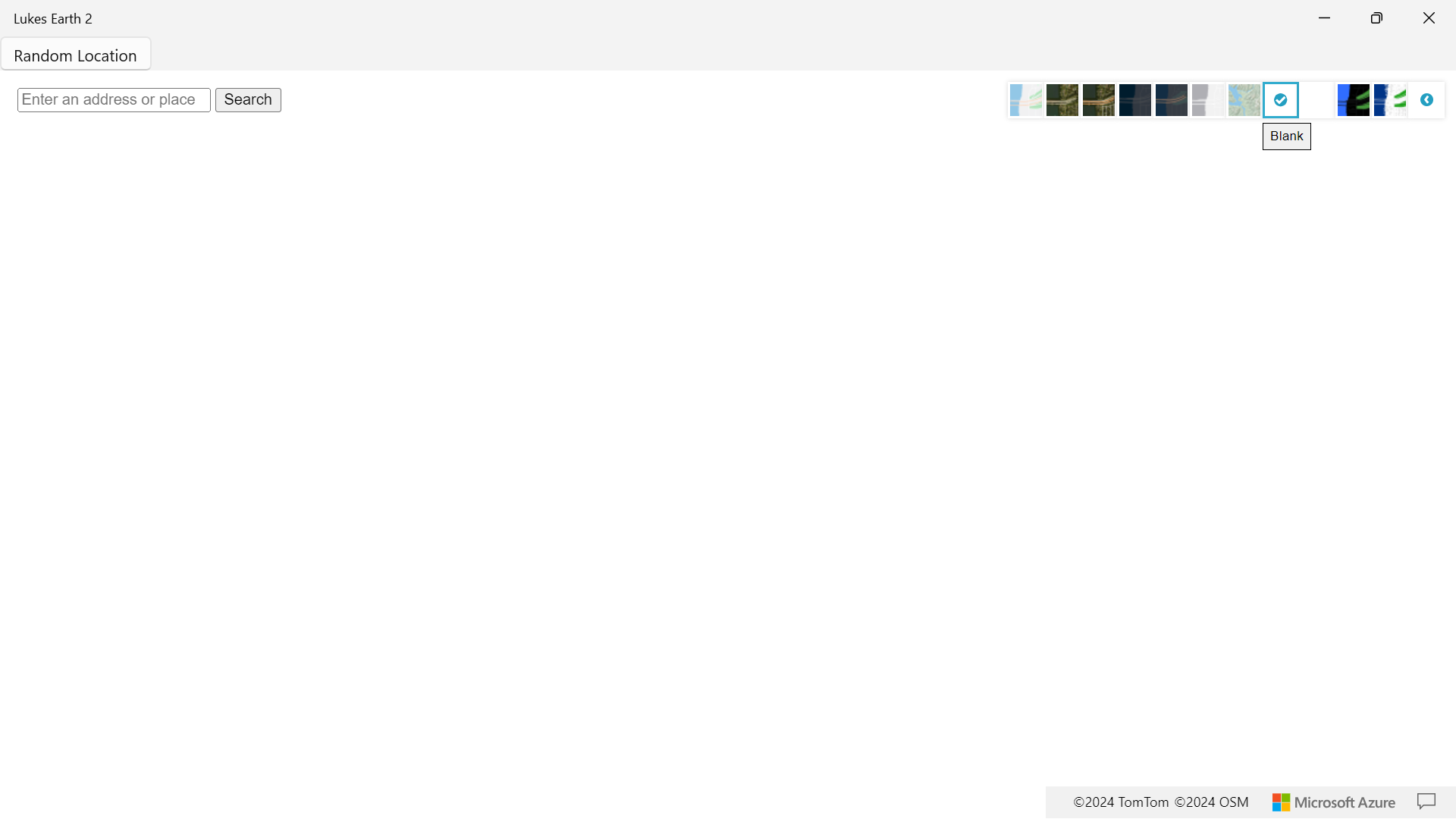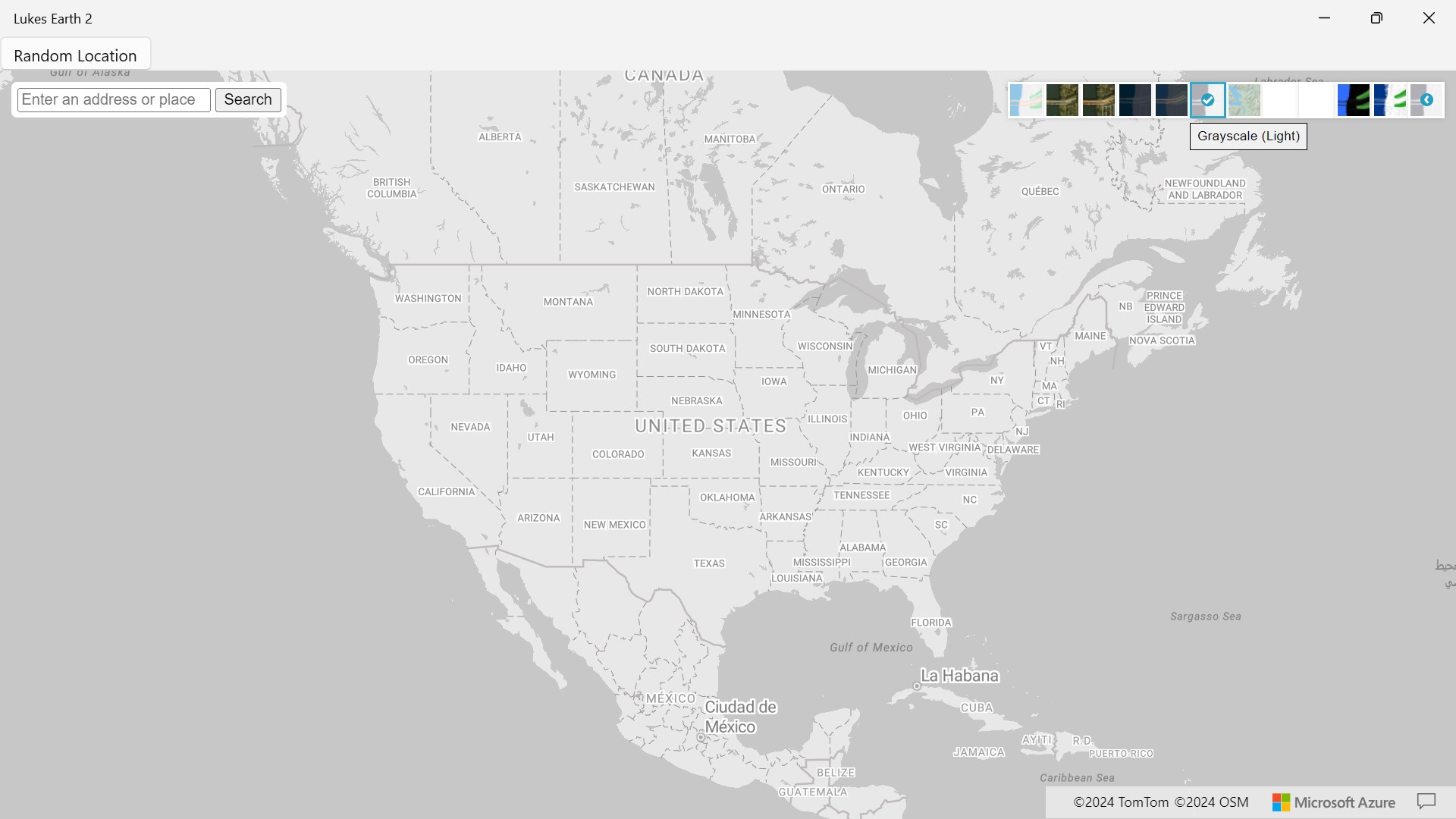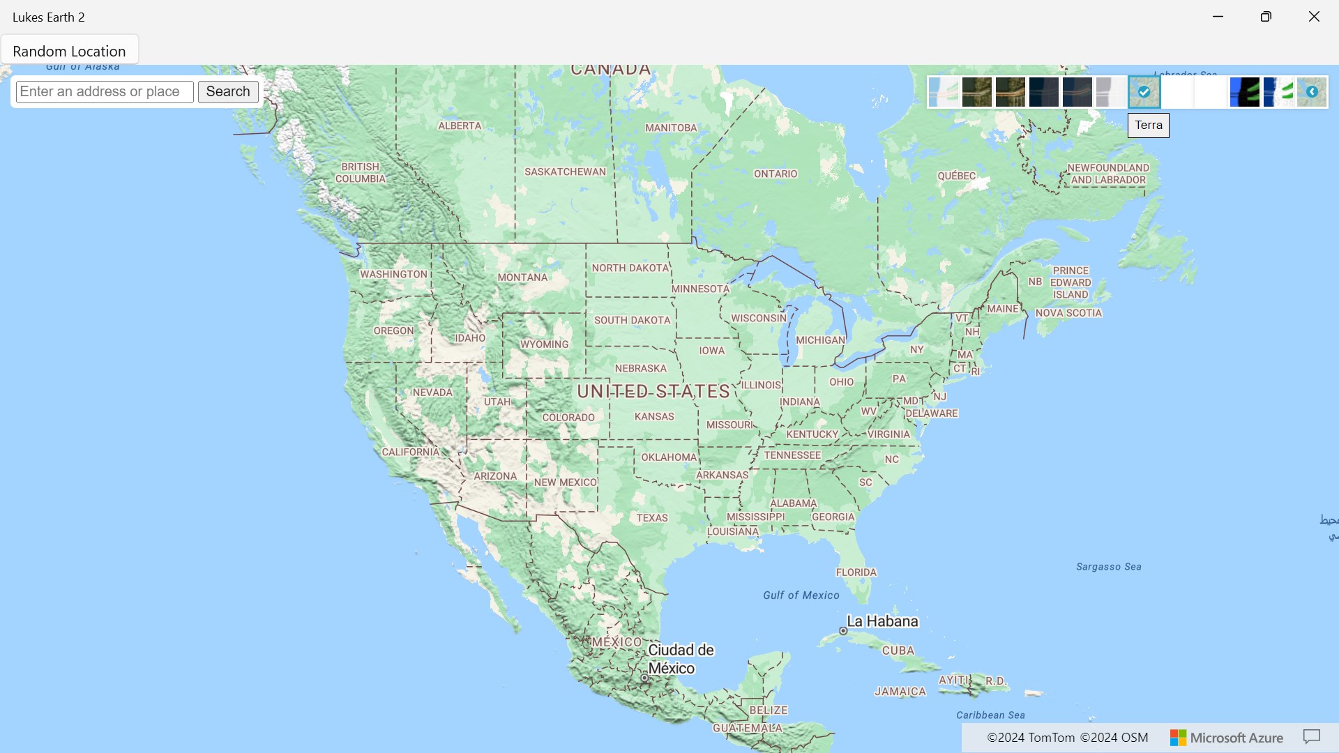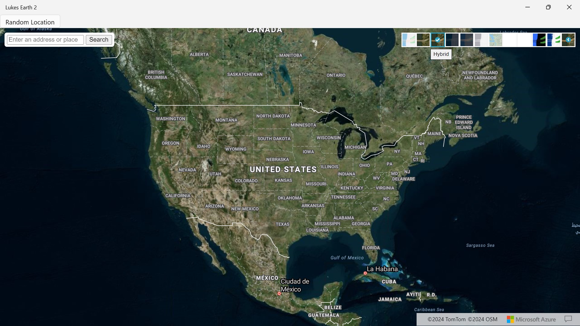 Lukes Earth 2 is a computer program that renders a 3D representation of Earth based primarily on satellite imagery. The program maps the Earth by superimposing satellite images, aerial photography data from azure maps, allowing users to see cities and landscapes from various angles click on top right hand corner on arrow to change select style it has a search bar search anywhere in the world it has different styles like Road, Satellite, Hybrid, Grayscale (Dark), Night, Grayscale (Light), Terra, Blank, HighContrastDark, HighContrastLight and a random location button
