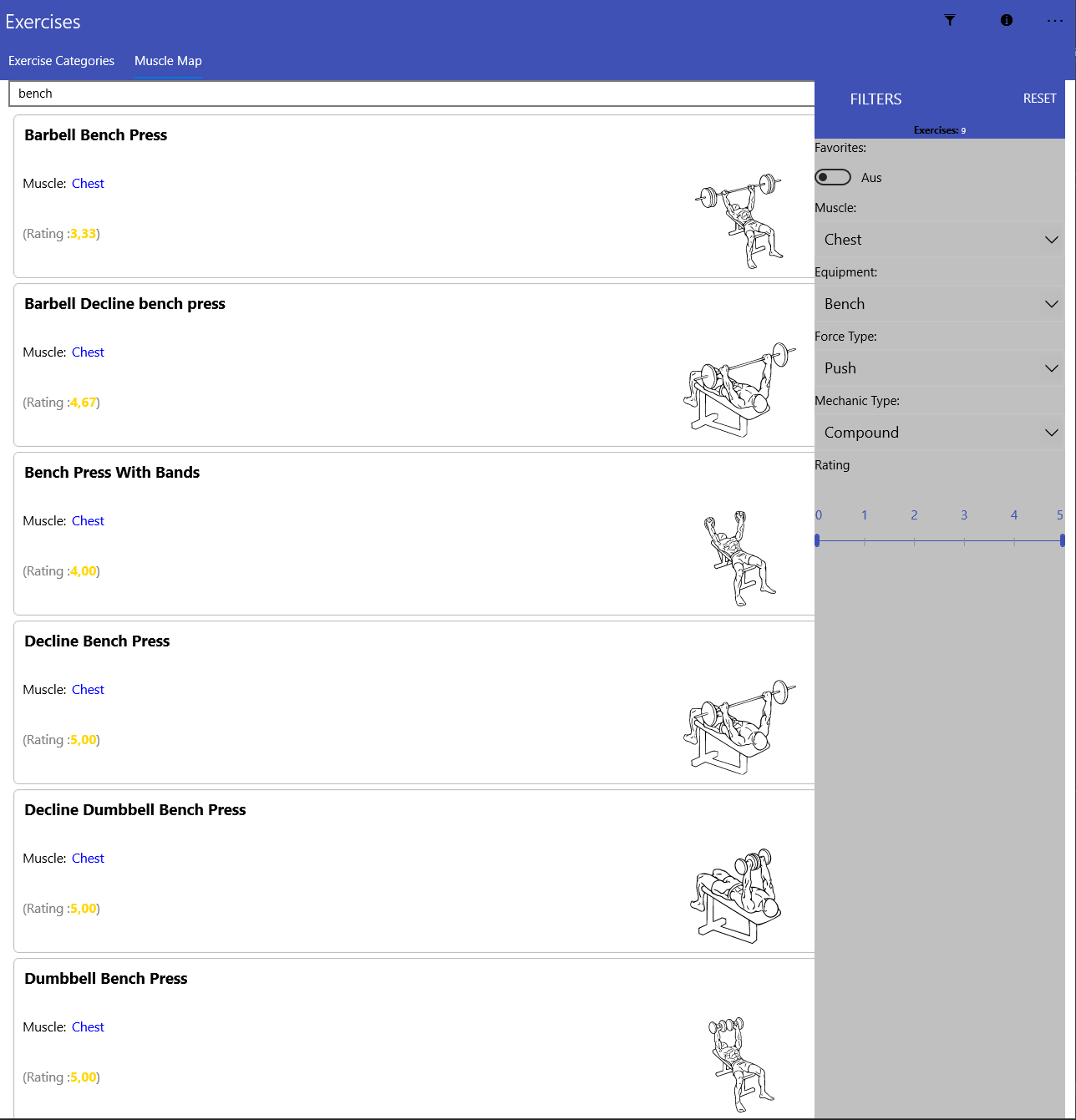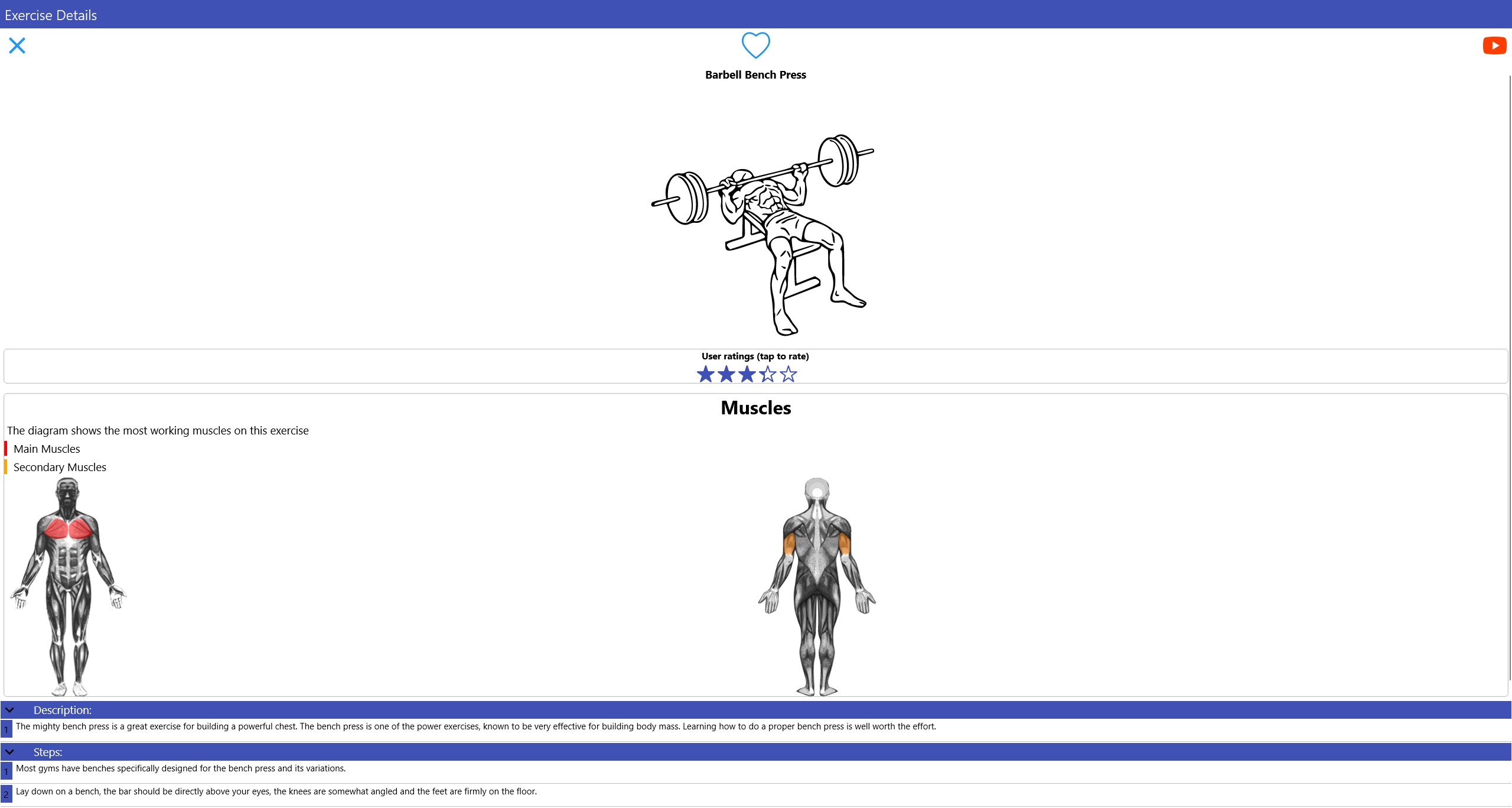 On the illustrated human muscle map, you filter each muscle group to see related exercises.Exercise details also shows secondary muscle groups worked when you execute it.Step by Step exercise guide Rating for each exercises rated by real users and professionals Favorite your exercises and filter those onlyYoutube videos for all exercises